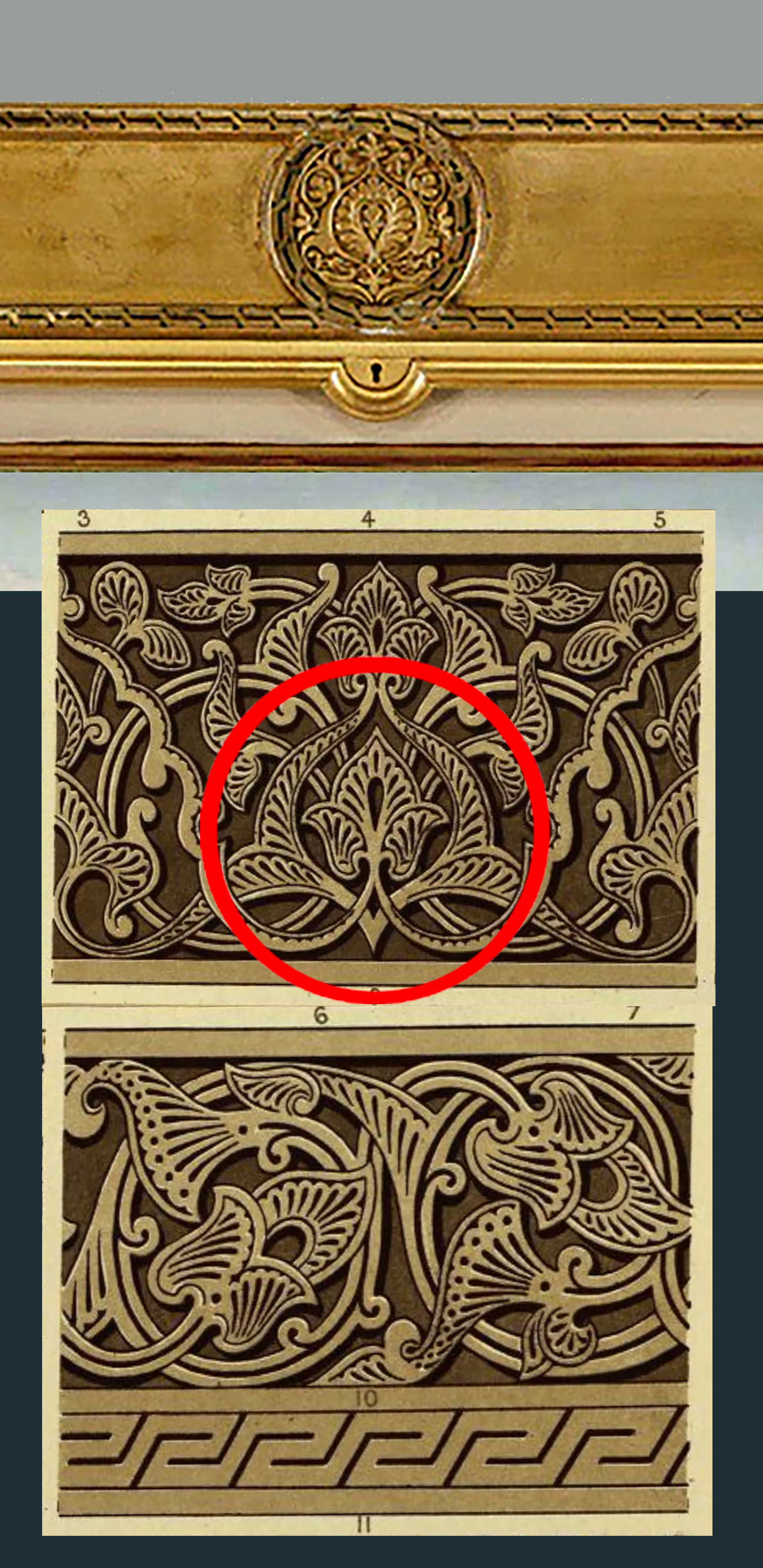 Holman Hunt (1827-1910), The lantern maker’s courtship, 1854-61, 54.8 x 34.7 cm., Birmingham Museum & Art Gallery; (left) detail of roundel on frame with medallion from Owen Jones, ‘Arabian No 5‘; (right) detail of frieze on frame with source ornament from Jones, ‘Arabian No 2‘