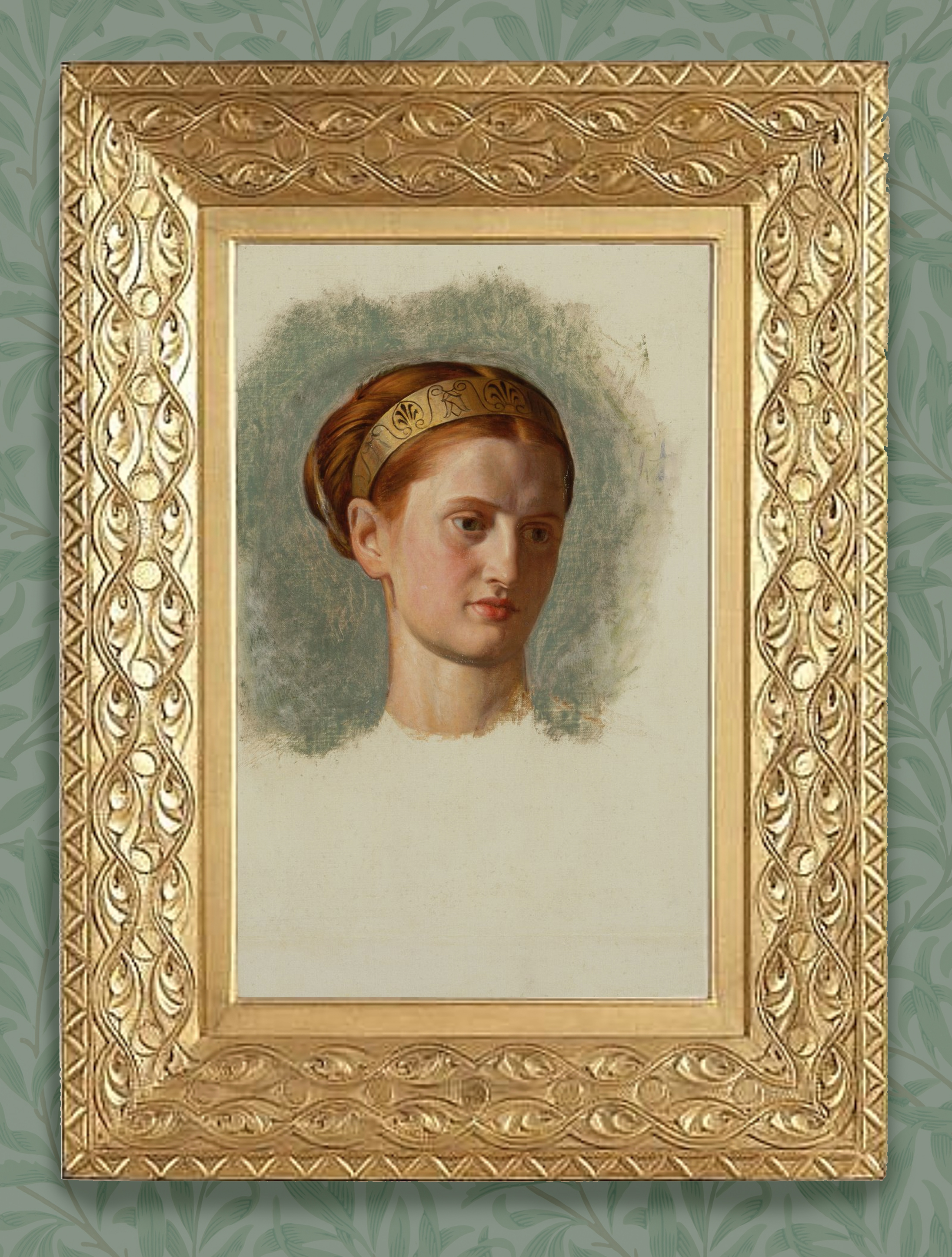Another example of Hunt’s versatility in designing is the gilded frame for an unfinished study (probably of his sister-in-law, Isabella Waugh); it was executed at least a decade after the painting, and is based on an 1876 drawing of architectural ornament he had made in Jerusalem. The double band of undulating half-leaves on the frieze is punctuated by roundels engraved to simulate the phases of the moon (thus turning the portrait of a young Victorian woman wearing a classical diadem into an image of the goddess Artemis). Divorced from its Palestinian setting, this motif appears the essence of art nouveau, and Hunt re-used the braid of undulating half-leaves again for the garland on the top edge of the small copper May Morning… frame (see below).