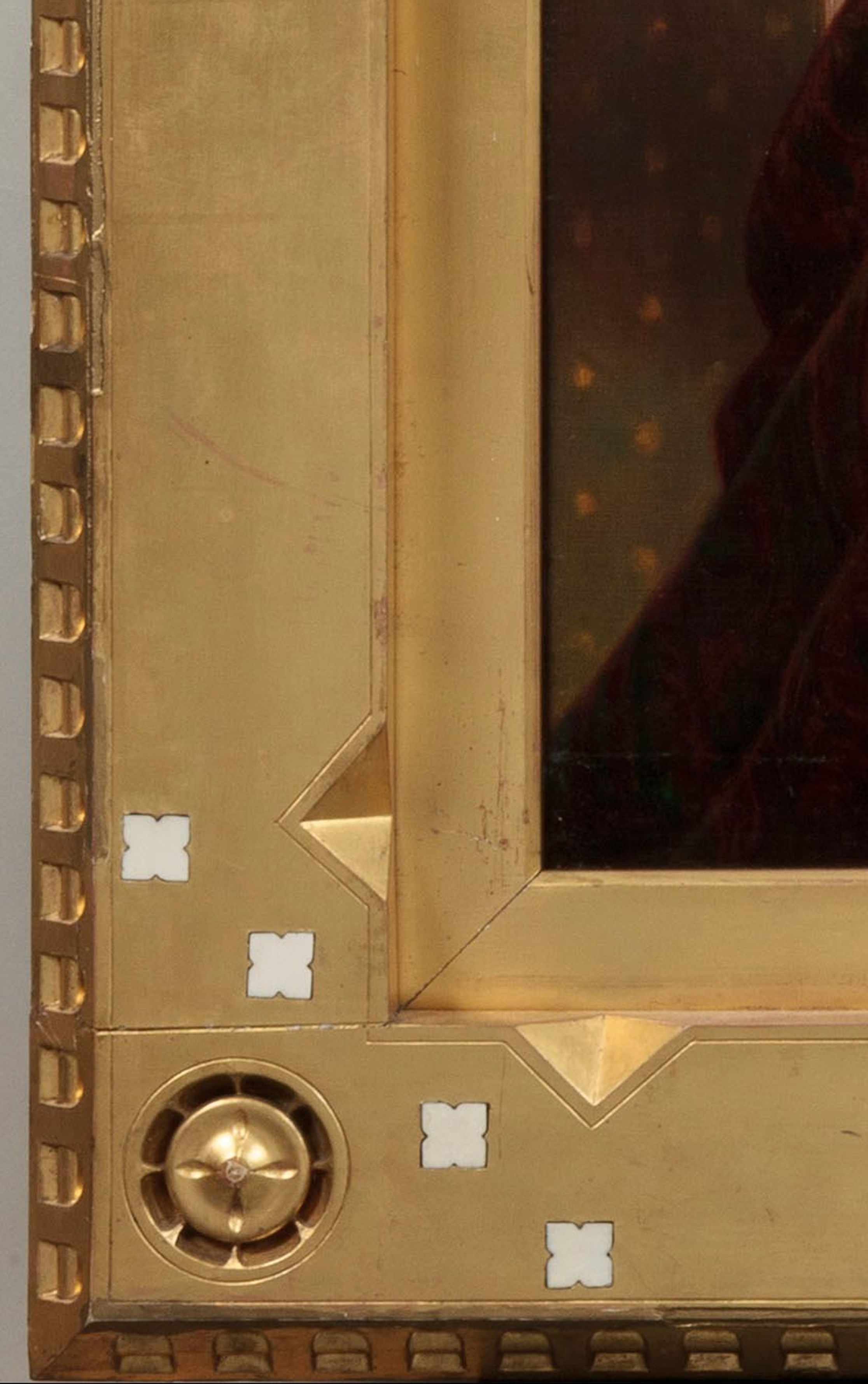 Jan van Eyck’s portrait of his wife, Margareta, for example (acquired by the museum in 1808), was on display when they passed through Bruges. Frames like this one, and like others by Van Eyck and his peers, share elements which would reappear in designs by Brown, Hunt and Rossetti – simple, often shallow, profiles; flat top edges or central friezes, sometimes bordered by small mouldings; deep hollows or slanting rainsills at the sight edge; inscriptions which expand upon the image in the painting; finishes which were not just gilded but might be stained or painted; and horizontal or vertical ‘butt’ joints instead of mitred joints [8].