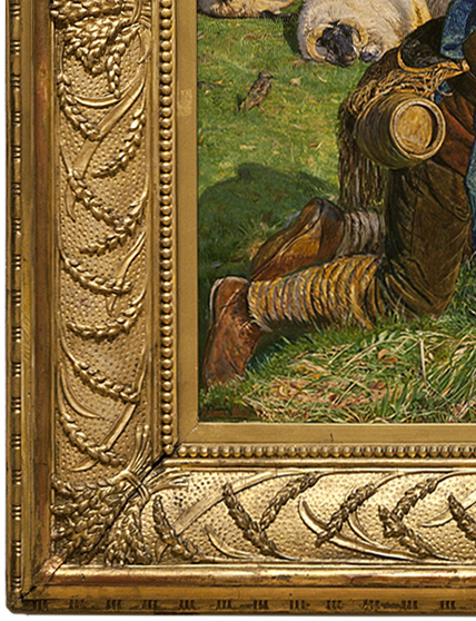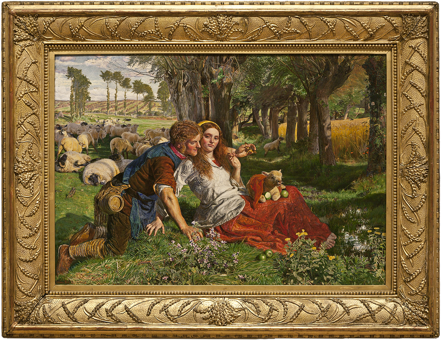 It is hard for us now to see the cleverness and radical nature of Hunt’s design for the frame of The hireling shepherd, since we are no longer attuned to a contemporary and changing fashion in frames – nor to an establishment style of historical revivals, which had become increasingly fossilized during the first half of the 19th century, and which the growing mechanization of industrial processes had deprived of the carvers’ and gilders’ creative input. Hunt and Millais were rebelling against these banal and conventional forms, just as they were rebelling against idealized figures and ‘brown’ landscapes in their paintings.