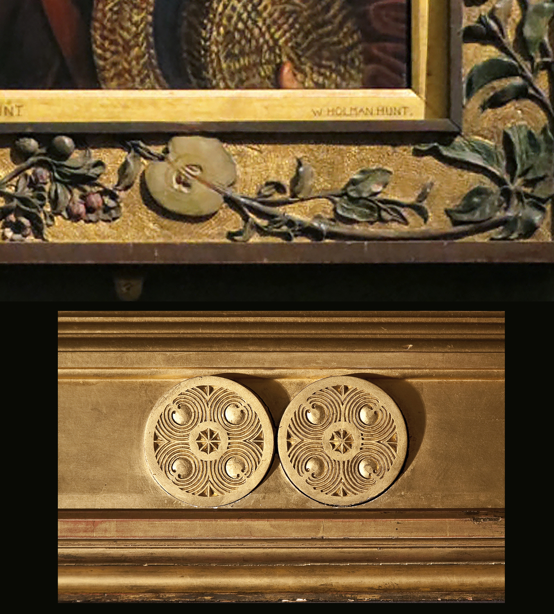 All the ornament is executed in compo, which the Pre-Raphaelite Brotherhood rejected to a large extent after coming into the ambit of the critic John Ruskin. Ruskin believed that no material should pretend to be something it wasn’t – so composition which pretended to be wood was undesirable, and so was gilding on a layer of smooth gesso, since this aspired to look like solid gold or ormolu. Economics and the greater ease of producing cast ornament partly undermined this resolution as time went on – some of Hunt’s frames depended on repeated or re-used motifs which could be turned out ad infinitum from a single carved mould – but it is also true that the Brotherhood gave a great boost to the art of carved wooden frames in the second half of the 19th century, and that Hunt produced designs which were beautifully carved by framemakers such as Joseph Green and Foord & Dickinson. He also, unlike Ford Madox Brown and D.G. Rossetti, favoured gilding on gesso, rather than directly onto (usually oak) wood; only one of his frames leaves out the gesso layer [5].
