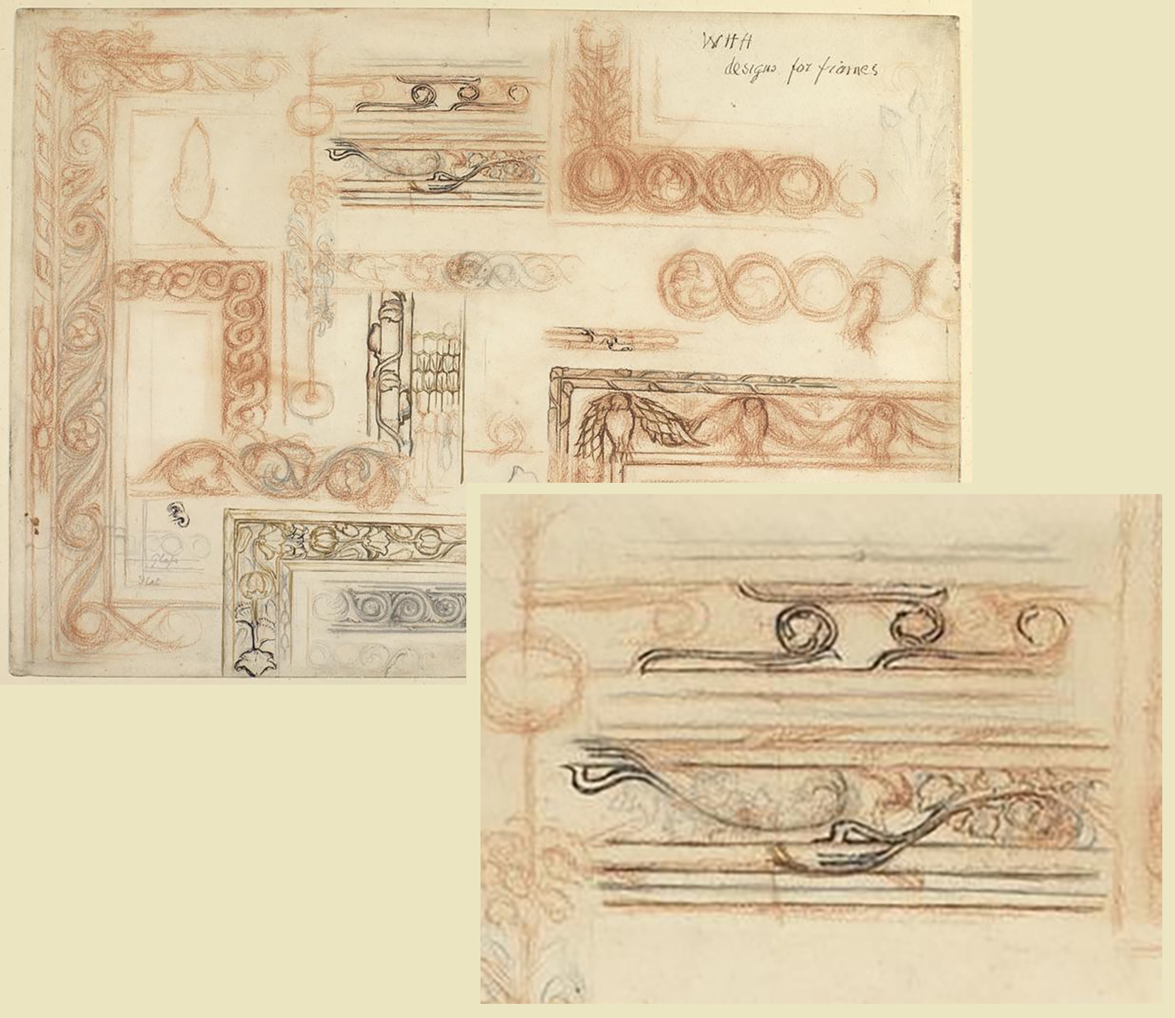 Hunt himself may well have had a hand in the design (a drawing of frames and elements of frames was sold in a group of three by Bonhams in 2008, one sketch of which is close to the scrolling foliage and fruit of the pilasters, although dated 1875), and it may also have been the production of this frame which confirmed him in giving the work of the two May Morning frames to the Guild of Handicraft.