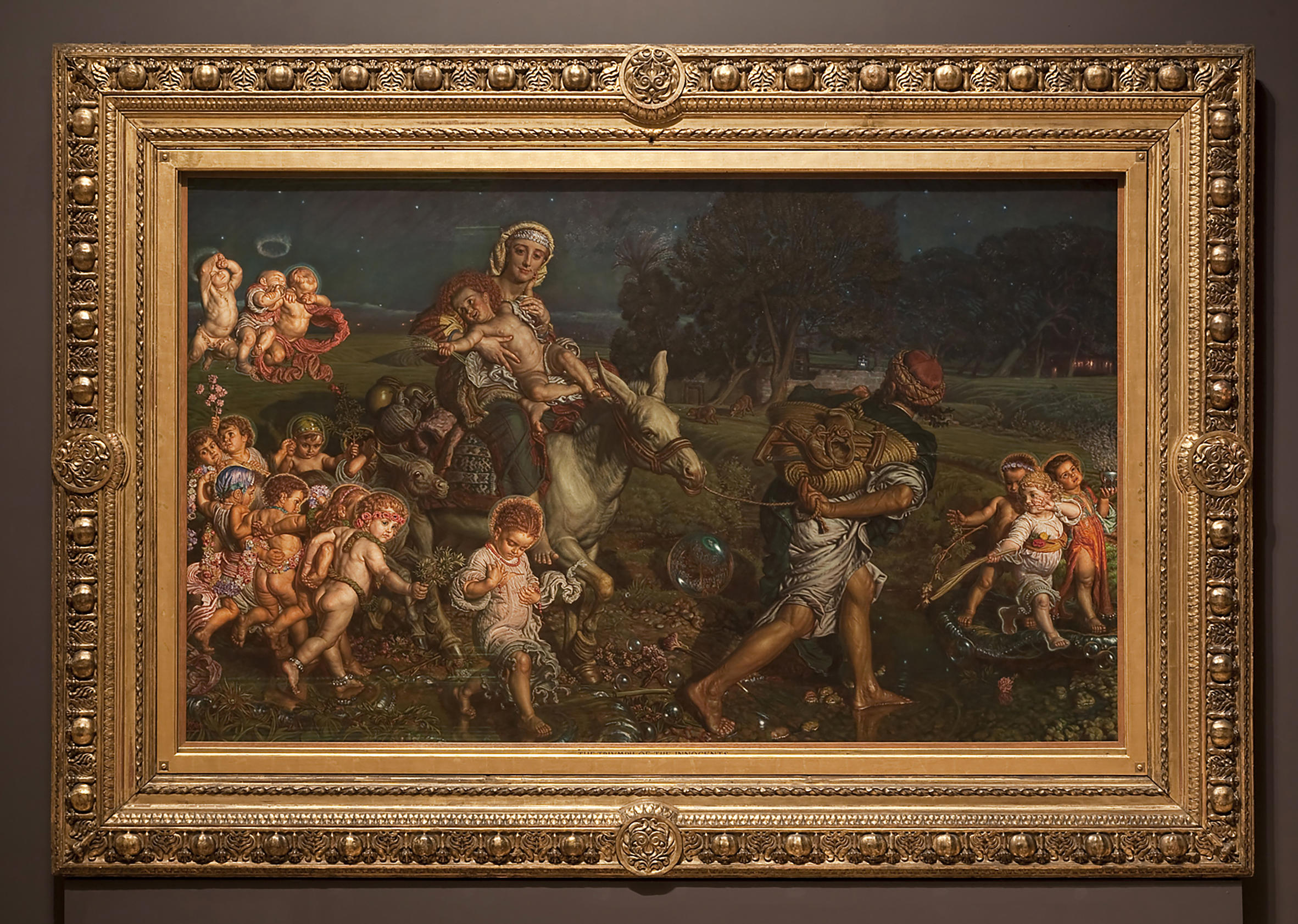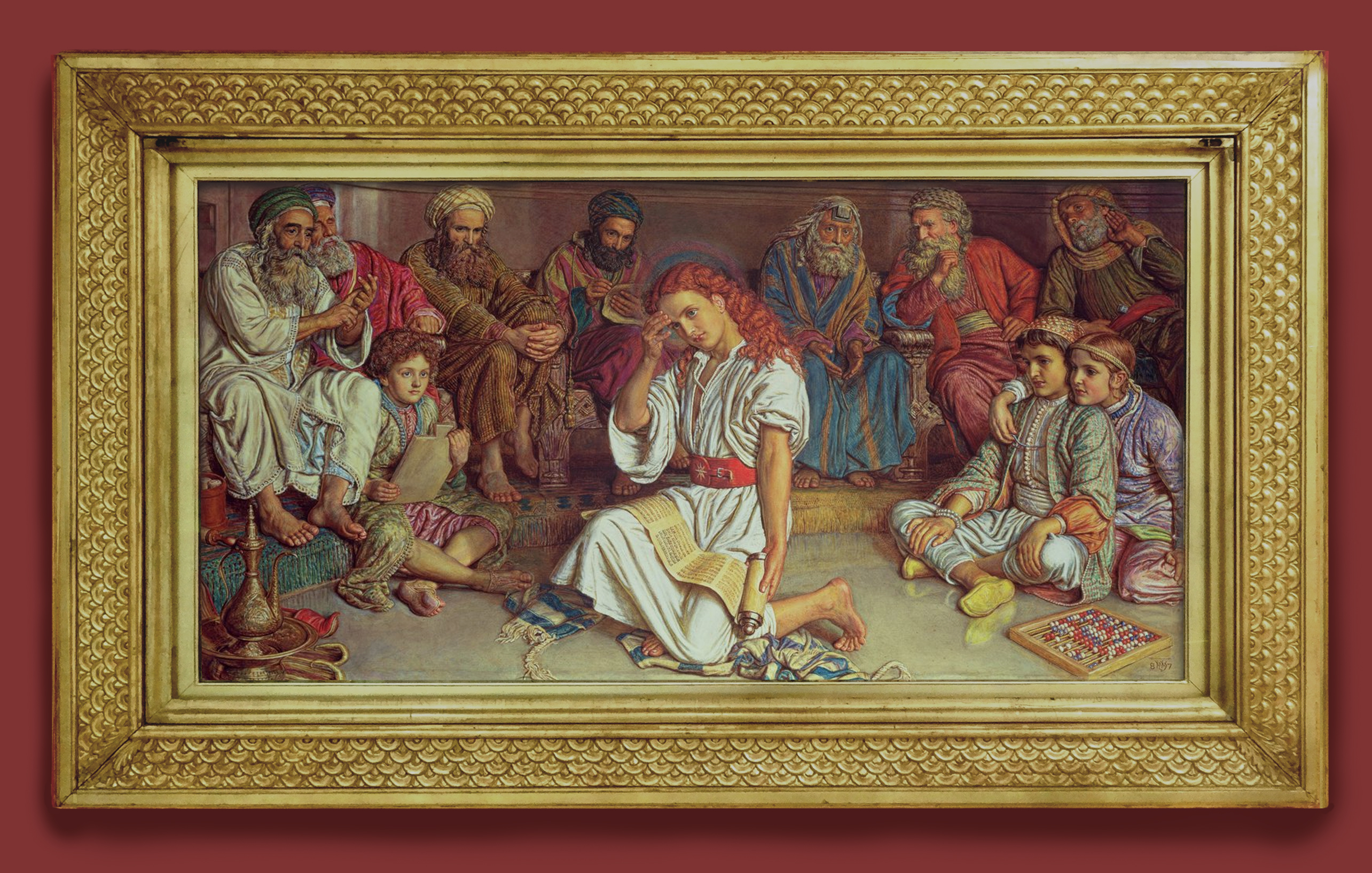 What these symbols are doing – just as on the frame of The scapegoat – is enlarging upon the painted image. In the picture we are shown an incident in the life of the young Christ, when he wanders away from his parents and is discovered by them arguing with the doctors in the temple; but then what the frame indicates to us, beyond the simple narrative, is that the New Law of Christ (the sun) will outshine the Judaic Law of the Old Testament (the eclipsed moon). Hunt has also used the silhouette of the frame, with its shallow gabled effect, and the rails crossed at the bottom corners, to suggest the outline of a temple, in an imaginative variation on a Gothic or Renaissance altarpiece.
