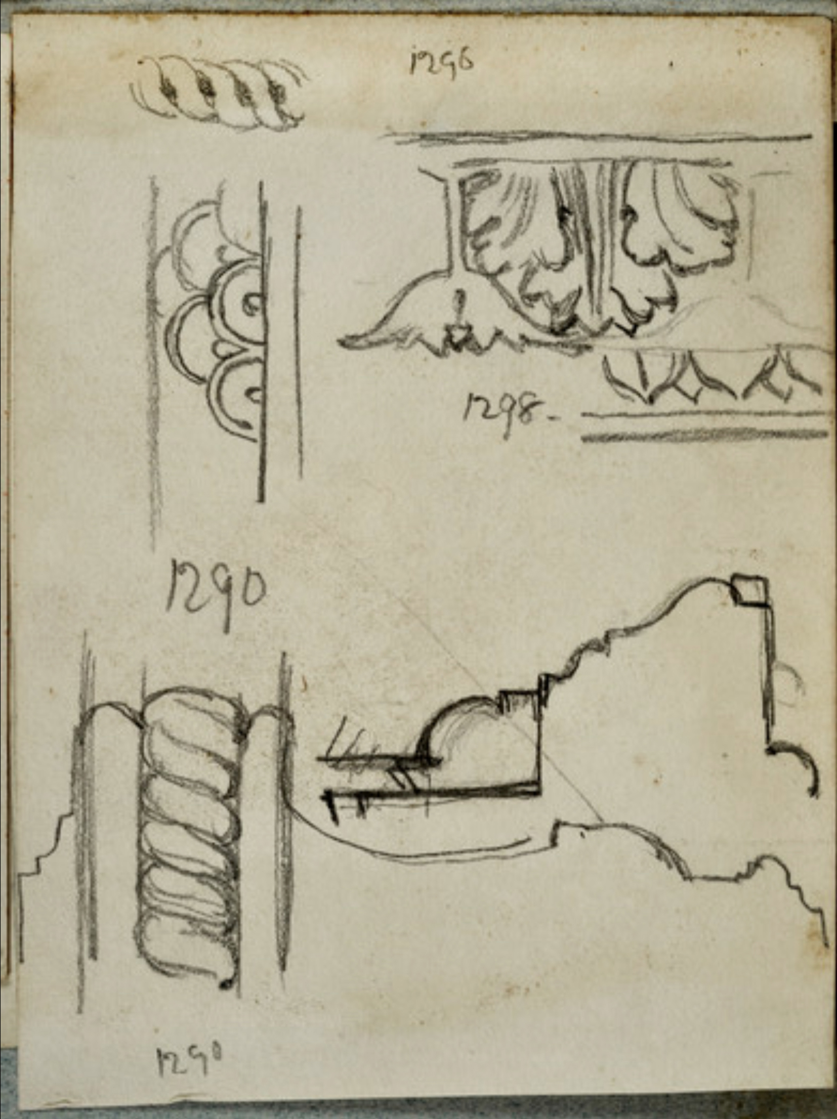Holman Hunt, The shadow of death, detail (large version, Manchester), with drawing of stone ornament, Jerusalem, c.1871, pencil, 12.7 x 17.8 cm., Ashmolean Museum