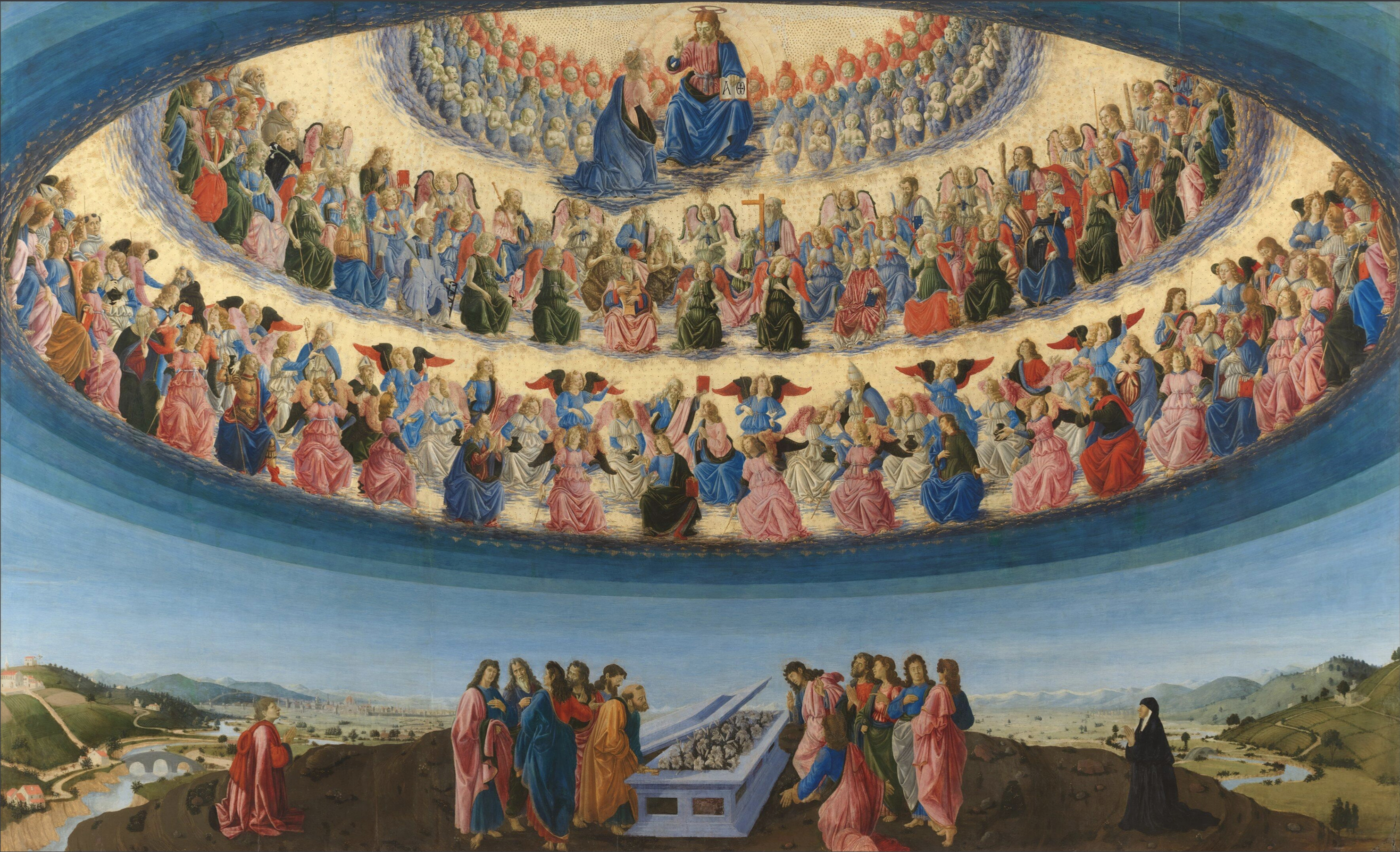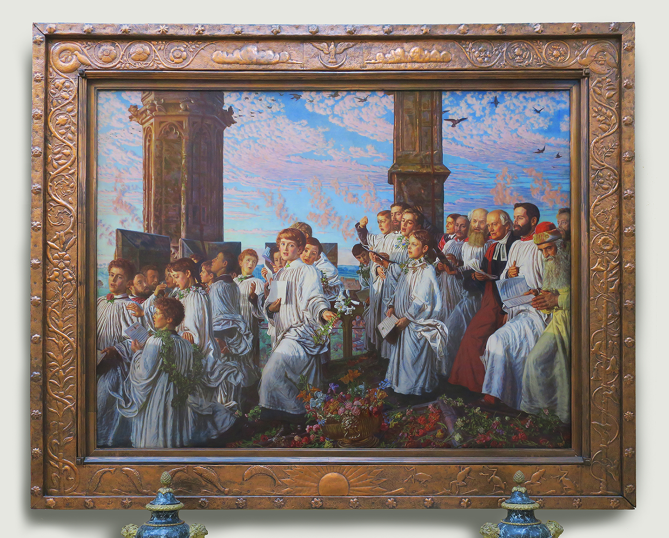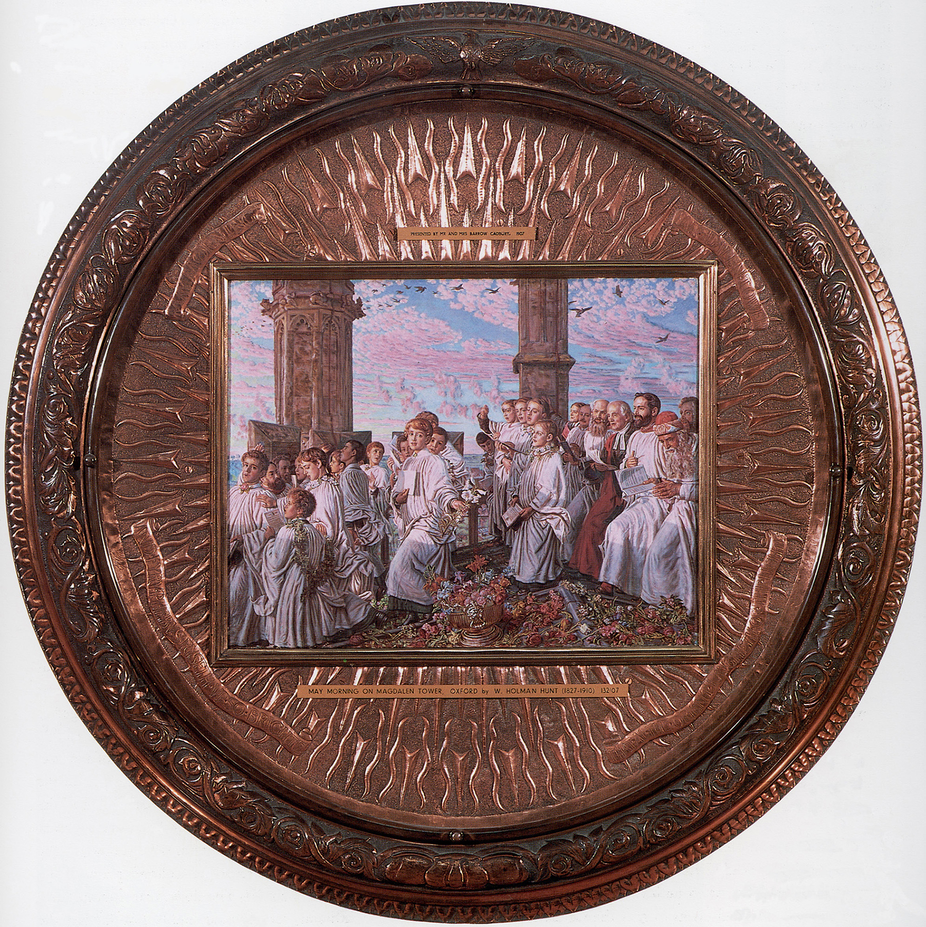 In 1888 Hunt began to work on two versions of a subject he had wanted to paint for many years – perhaps from as early as 1851, when he visited Magdalen College in Oxford. He saw it both as the celebration and preservation of a peculiarly English ceremony, and as an allegory of religious faith expressed through a symbolic worship of the sun. It records the service held on the first of May, on top of the tower of Magdalen College chapel, when the choir greets the dawn with hymns and madrigals. In the 17th century the diarist Anthony Wood had noted that members of the College choir