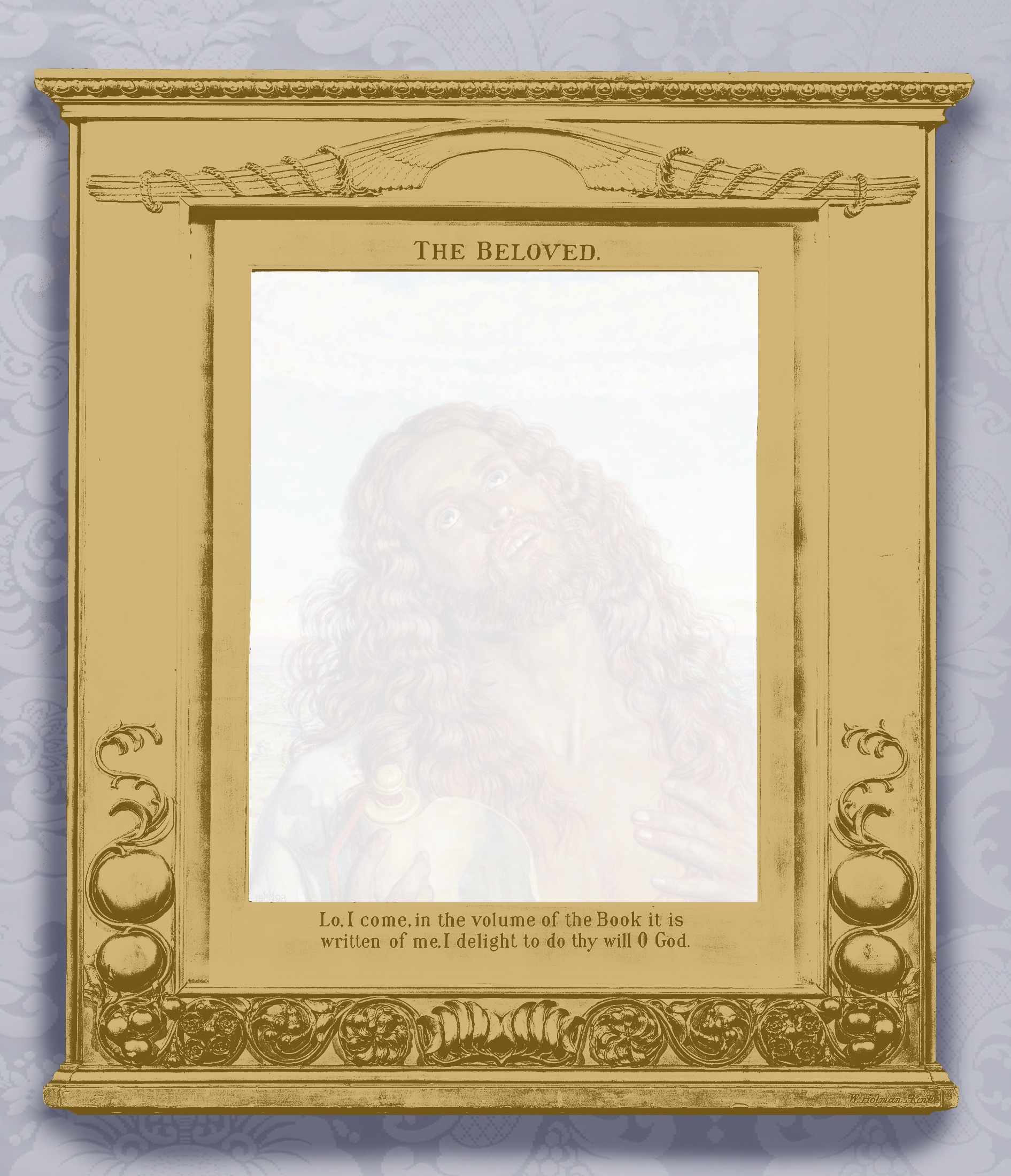 Frederick Stephens designed a frame for signed proofs from the resulting engravings, based on the artist’s own frames for the two versions of the painting. It was a gilded oak plate frame with no mouldings at the contour or sight edge – just a flat frieze – but it had most of the symbols from the model carved in a simplified form and applied to the wooden base. It even included a white-painted inlay, imitating the original ivory inlays, which carried the inscriptions of the latter. A beautifully conserved and complete example in the collection of Gill & Lagodich, New York, is discussed on their website, with close-up details of the ornament. Prints in these frames apparently sold for 15 guineas each (£15.15s 0d or £15.75) [36].