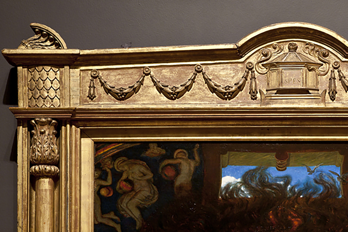 Hunt’s last great frame was completed five years before his death in 1910, for The Lady of Shalott, c.1888-1905, Wadsworth Atheneum, Hartford, which he painted with the help of Edward Hughes. It has an aedicular, temple-like form, which had become very popular with the so-called Olympian painters in the last quarter of the century. They (Leighton, Alma-Tadema, Burne-Jones, Poynter) each used a small number of patterns repeatedly on their work, however, whereas Hunt’s frame is a unique (and uniquely beautiful) creation, designed – like all his frames – to support and intensify the theme of this particular painting. The columns are twined with briars, connecting the Lady to that other imprisoned heroine, Sleeping Beauty, and the scrolling anthemia or honeysuckles at the bottom spring from a funerary urn.