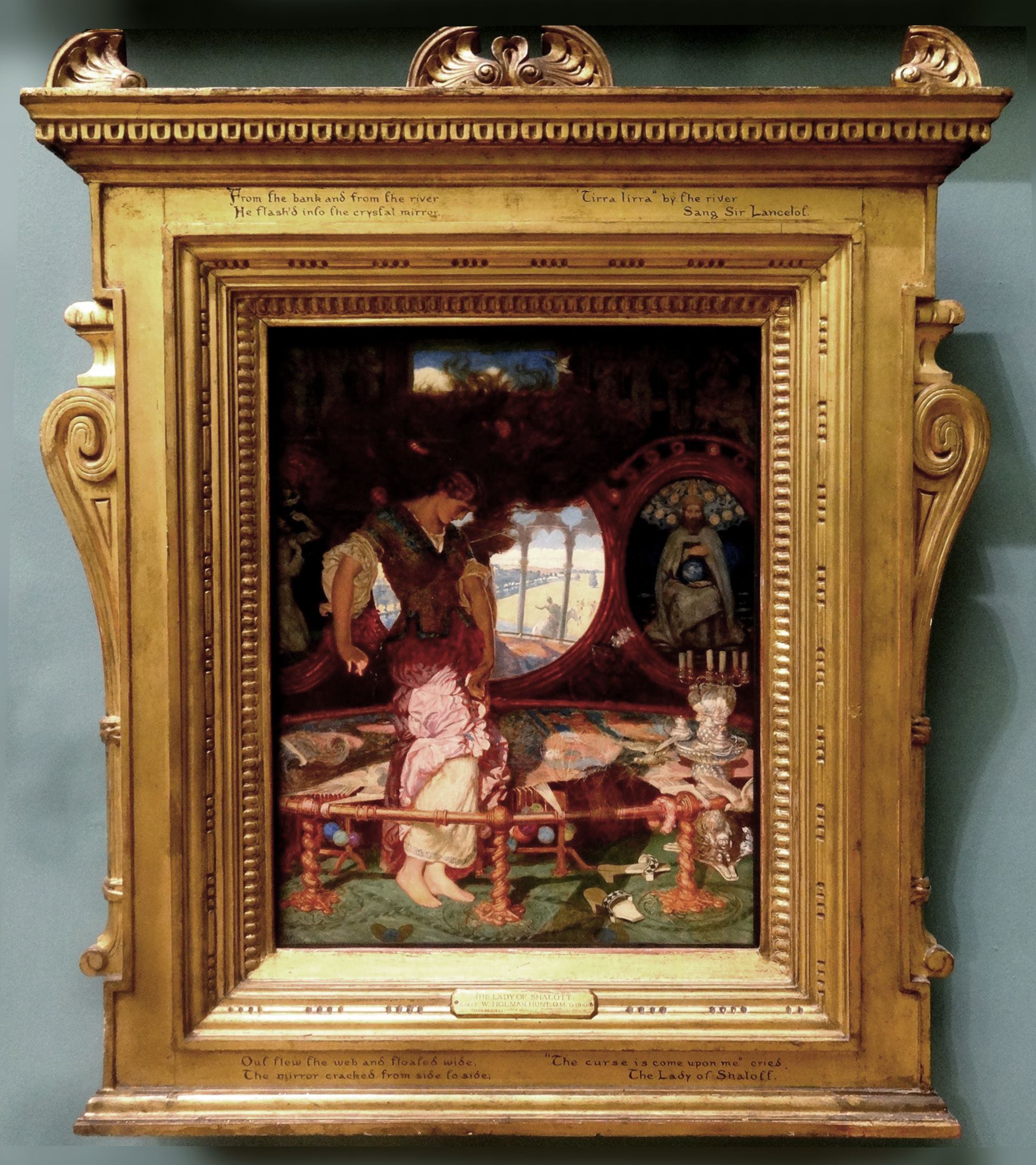 The small version of the Lady of Shalott, which seems to have been begun as an experimental ground for the large work, was finished when sold, and was given a frame similar to the one made for Rossetti’s portrait some years before. Without the oval inlay used for the portrait, and with a rainsill at the bottom of the sight edge, it creates a window through which the viewer – rather strangely occupying the space seen in the looking-glass on the opposite wall, which looks down to Sir Lancelot – looks in at the Lady. The frieze at top and bottom is inscribed with the lines from Tennyson’s poem which apply to Sir Lancelot and to the curse which he has unconsciously loosed on the Lady. The cornice is mounted with carved anthemia acroteria.