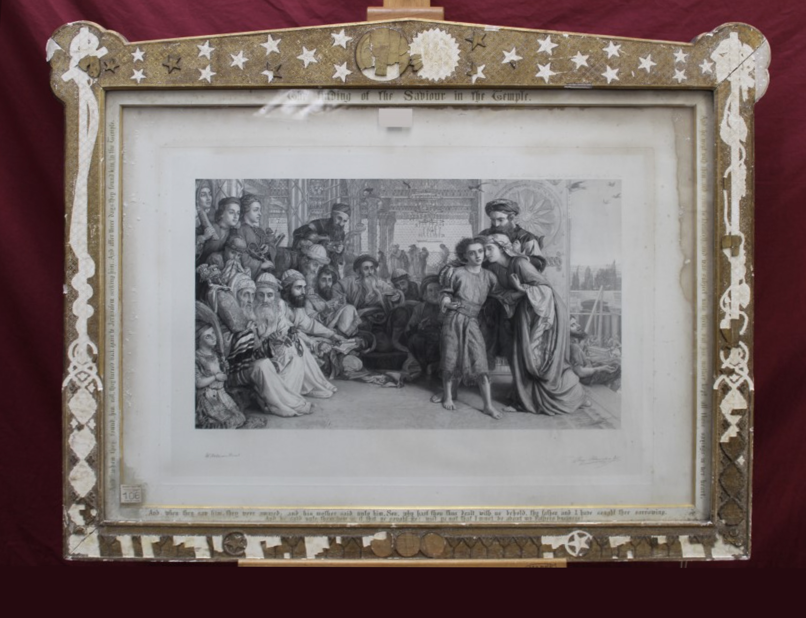 Holman Hunt (1827-1910), example of the frame adapted by F.G. Stephens for engravings of The finding of the Saviour, c.1867, carved & gilded oak (missing the inscribed ivory-coloured inlay), 84.8 x 108.6 cm., Christie’s, London, 4 May 2007, Lot 128