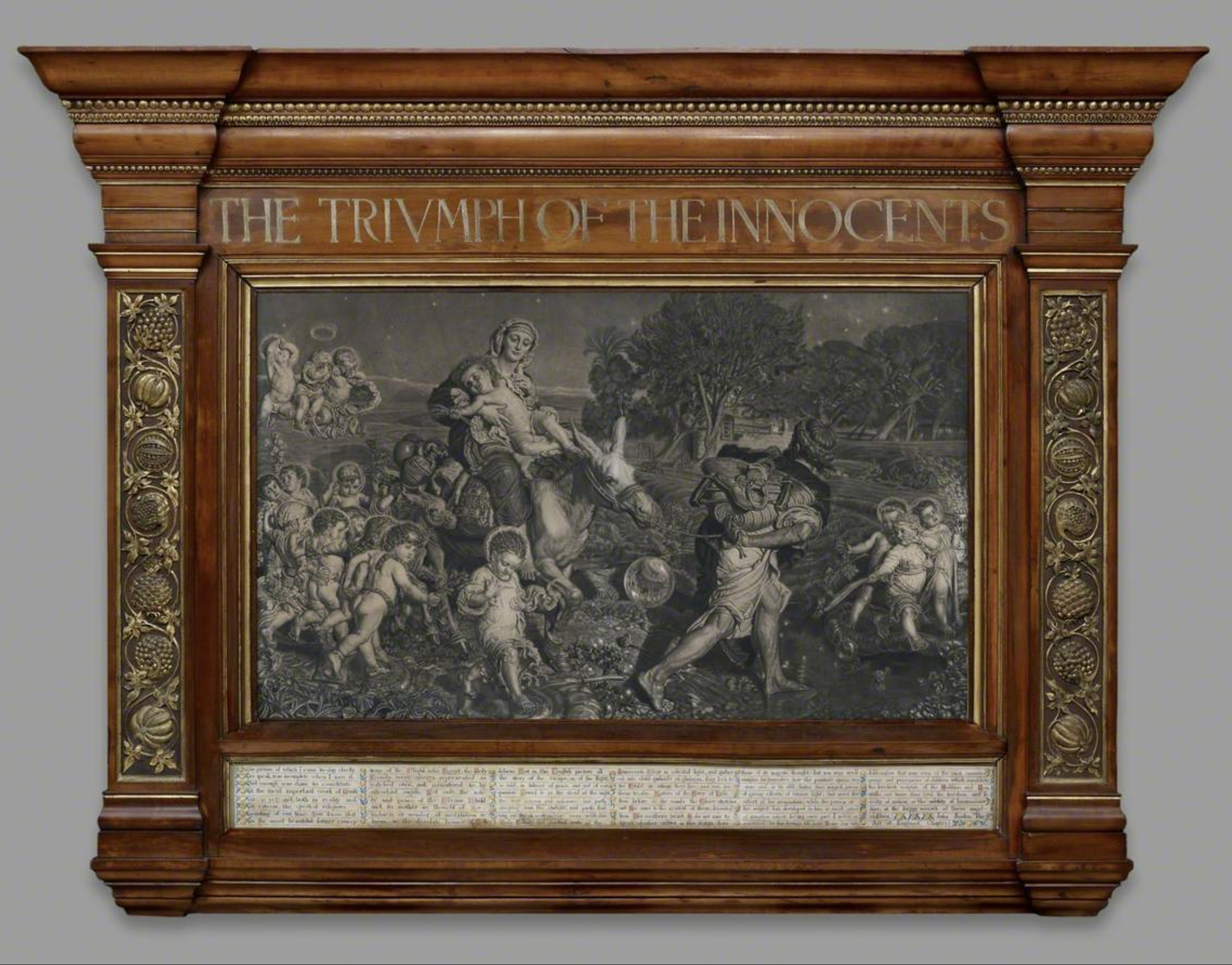 A unique frame was designed by Charles Ashbee for a photogravure of The Triumph of the Innocents (Manchester CAG). This was commissioned by T.C. Horsfall for the Manchester Art Museum, Ancoats, founded in 1886 by Horsfall with the aim of ‘ennobling the poor through art’. In 1888, Horsfall asked Ashbee for a beautifully-framed copy of some edifying subject, and Ashbee – whose Guild of Handicraft was, of course, already receiving support from Hunt – chose The Triumph of the Innocents. He designed a classical aedicular frame for it, parcel-gilt, in stained and polished wood, which close-frames the photogravure like a small altarpiece. It is quite large – about a metre across; it has a deep entablature with small architectural mouldings picked out in gold, and the title in gilded capitals on the frieze. The pilasters are decorated with gilded carved relief panels of scrolling foliage and fruit, including grapes and pomegranates, and there is a predella panel holding an illuminated quotation from Ruskin’s The art of England, ch. I, describing the picture.
