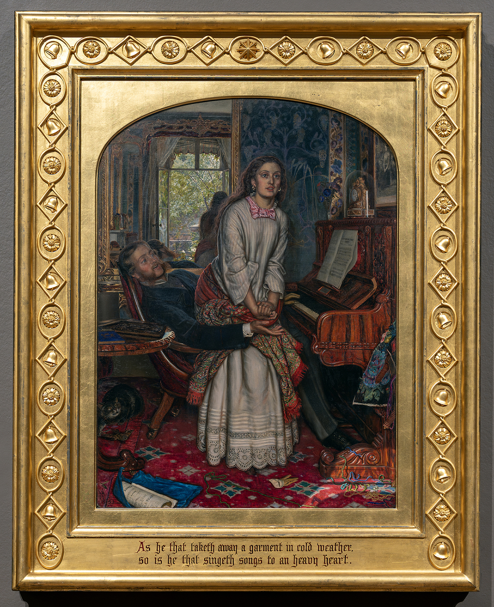and a star in the top centre symbolizing the redeeming light which floods the painting from the reflected window. The bottom rail is inscribed with a biblical text (‘As he that taketh away a garment in cold weather, so is he that singeth songs to an heavy heart.’ [7]), which – together with the three-sided decorative structure – looks back to a Northern Gothic altarpiece frame. Without this frame, the painting would lose many of the indications which would have prepared the contemporary spectator for a scene with a moral undertow; as it is usually illustrated without its frame in books from the late 19th century onwards, a modern student of Holman Hunt is deprived of the artist’s own commentary on his work.