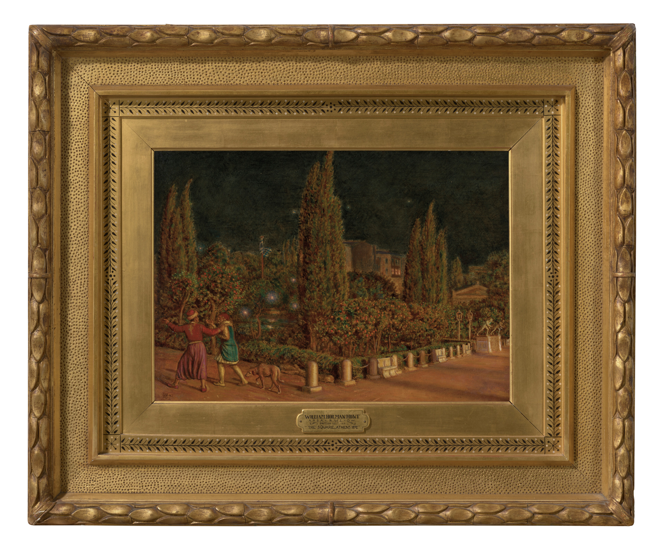 The small canvas in Birmingham began life in as the study en plein air made by Hunt on top of the tower at dawn, from which the background of the other, larger painting was taken. Its frame was the second to be designed and executed, in 1889-90, and is a clever remaking of a Renaissance tondo frame; the outer fruit-&-flower garland of the latter turned into an art nouveau braid of scrolling half-leaves, with a lark at the top centre, whilst the whole of the infill between the outer frame and the oblong sight edge has become a shimmering sunburst. The scrolls which float across these rays are inscribed with the title of the picture at the top, and at the bottom a quotation from Chaucer’s The Knight’s Tale:
