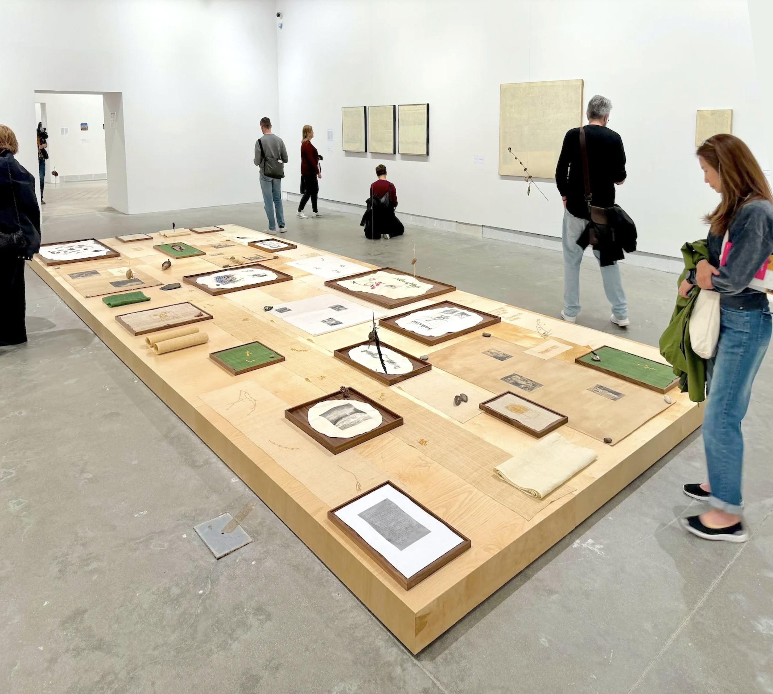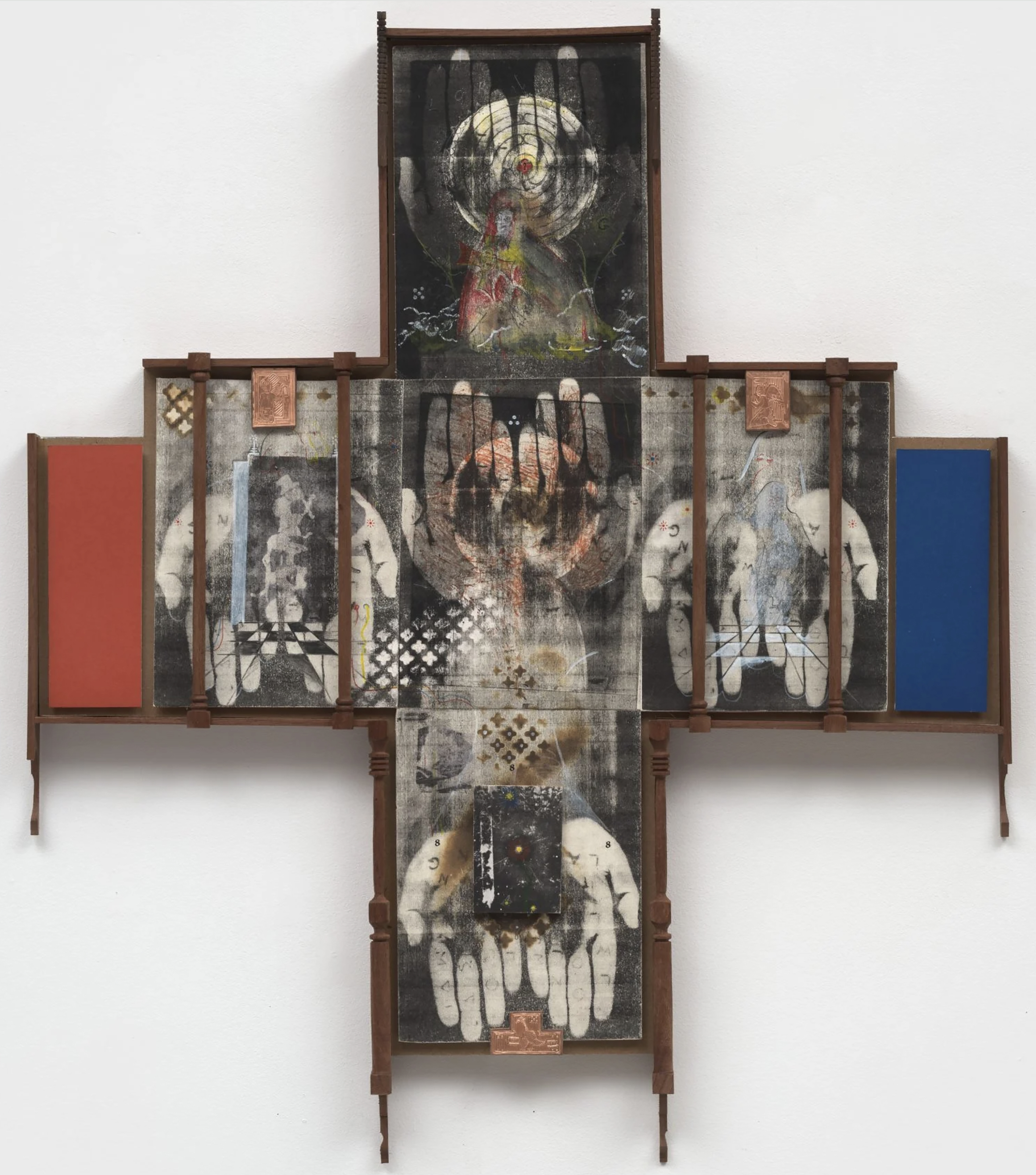 Harry Gould Harvey IV, Correspondence Radiator / Correspondence Resonator (Asteraceae), 2025, xerox, xerox transfer, coloured pencil, charcoal, black walnut wood, 91.4 x 78.1 x 7.6 cm. Courtesy of Harry Gould Harvey IV and P·P·O·W, New York © Harry Gould Harvey IV. Photo: JSP Art Photography