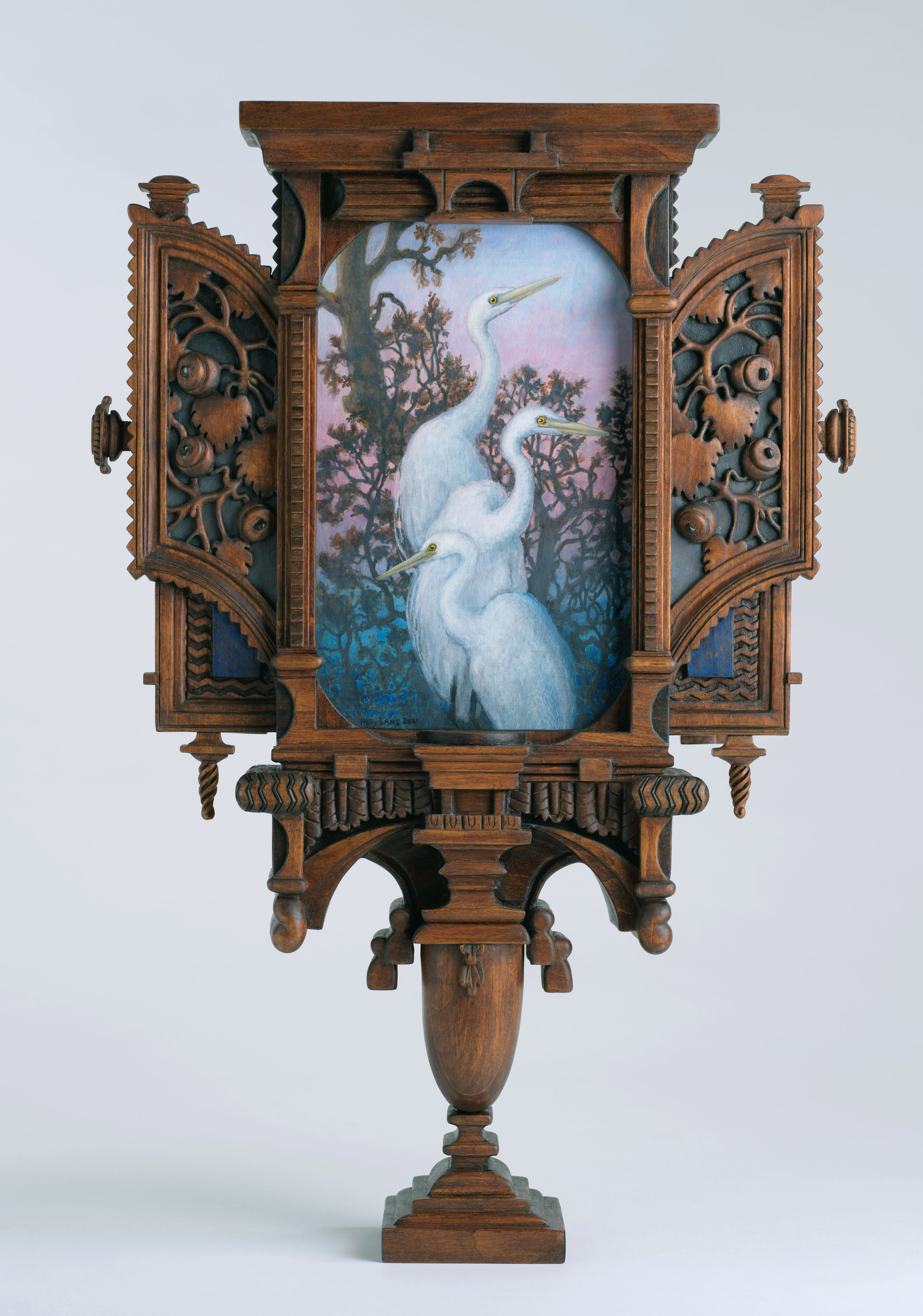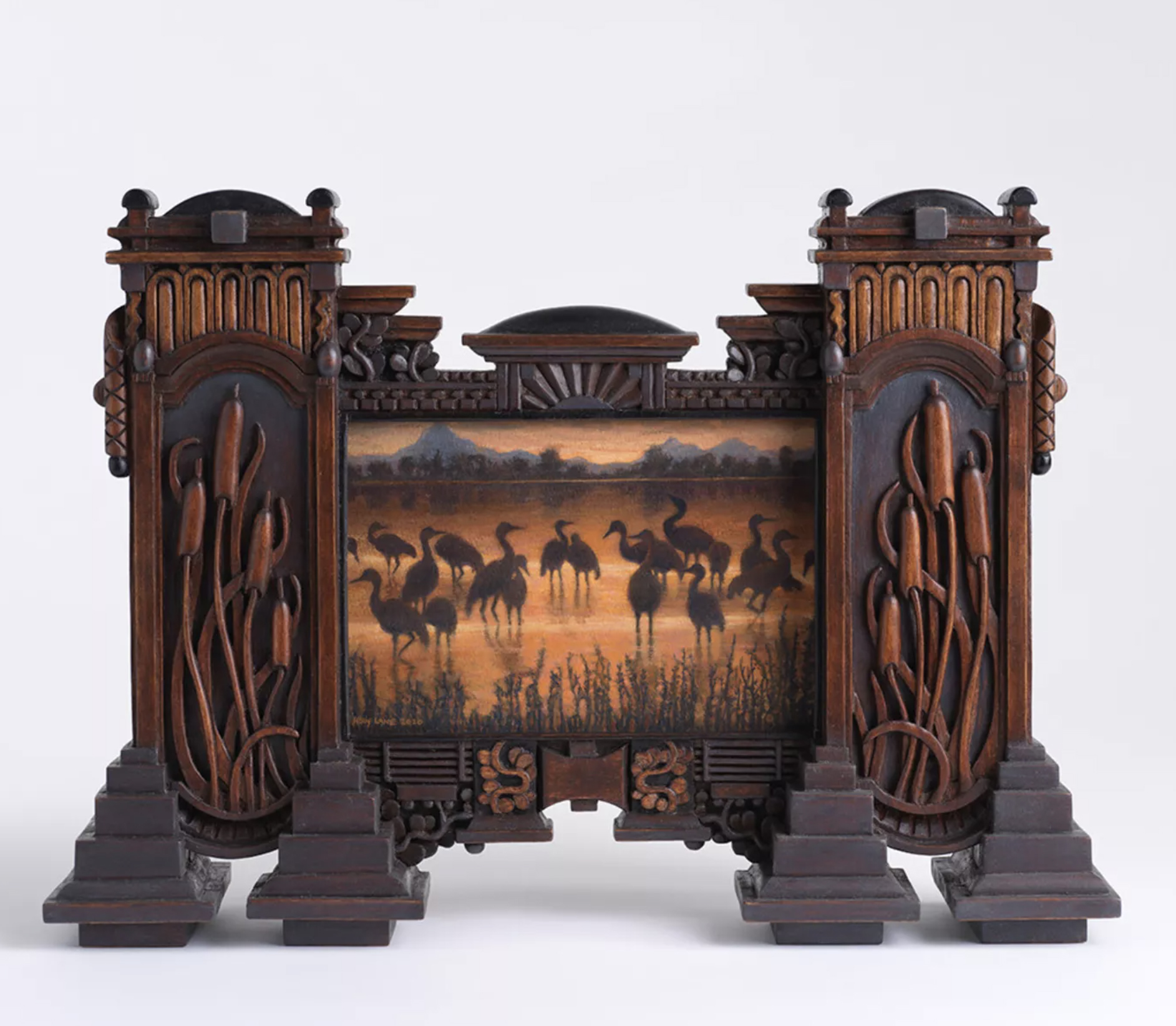 What can the mediaeval marginalia of illuminated manuscripts – books with painted decoration which includes precious metals such as gold or silver – tell us about our current moment of inspired and even outlandish framing? It’s an unexpected question, but a fruitful one. For artist Holly Lane, the bawdy and beatific doodles in mediaeval manuscripts sparked her frame-building journey. As a student at San Jose State University in the mid-1980s, she came across illuminated manuscripts in the library and was mesmerized by the way that the scrolling borders commented visually on the text.