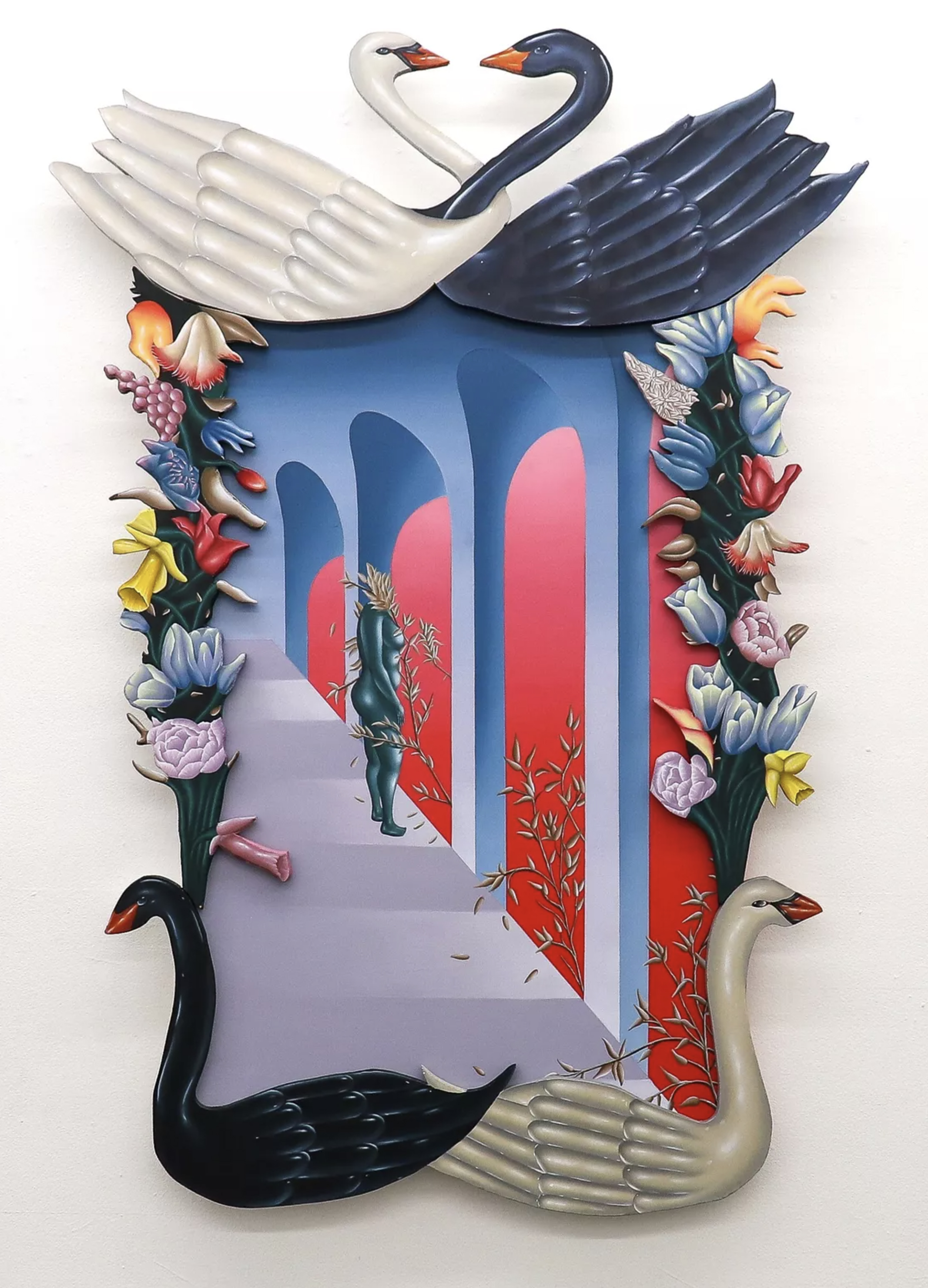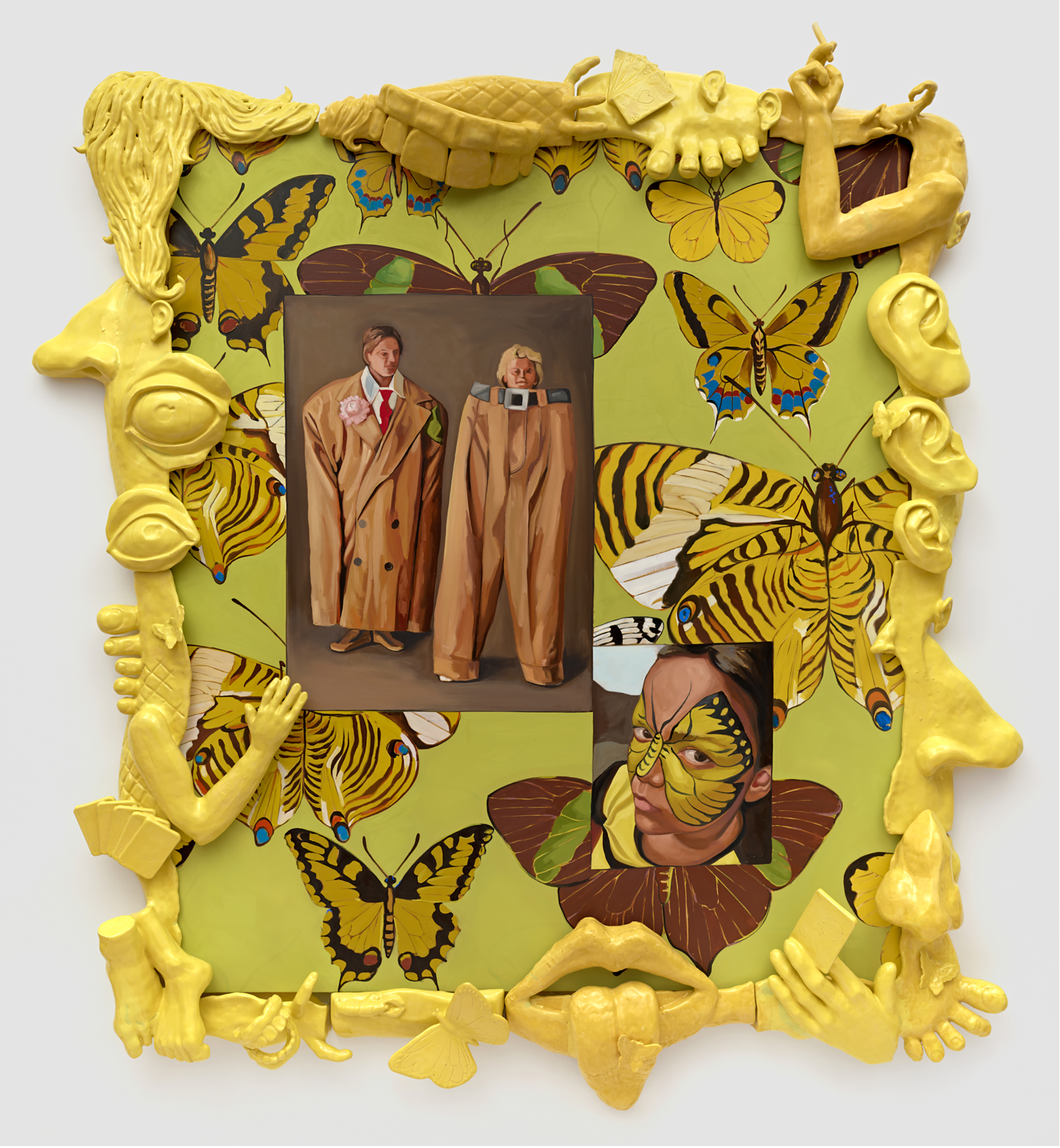 Frames are finally back in the spotlight – call it bordercore. A new wave of contemporary art is reconsidering the frame as a central character, one that is surreal, sculptural, and symbolic. Artists are using the border not just to contain, but to comment on, disrupt, or extend the work beyond itself. This is driven by the embracing of more bespoke, historic artistic processes, but also serves as a rebuttal to the superflat virtual age. More and more, paintings have been appearing at fairs and in exhibitions with statement frames, after a long era of often frameless display. If, for previous generations, the frame was a liability which could detract from the cerebral, intellectual, and aesthetic experience of the canvas, artists today are creating frames which attempt to pull us back into bodily reality, a haptic experience of art.
