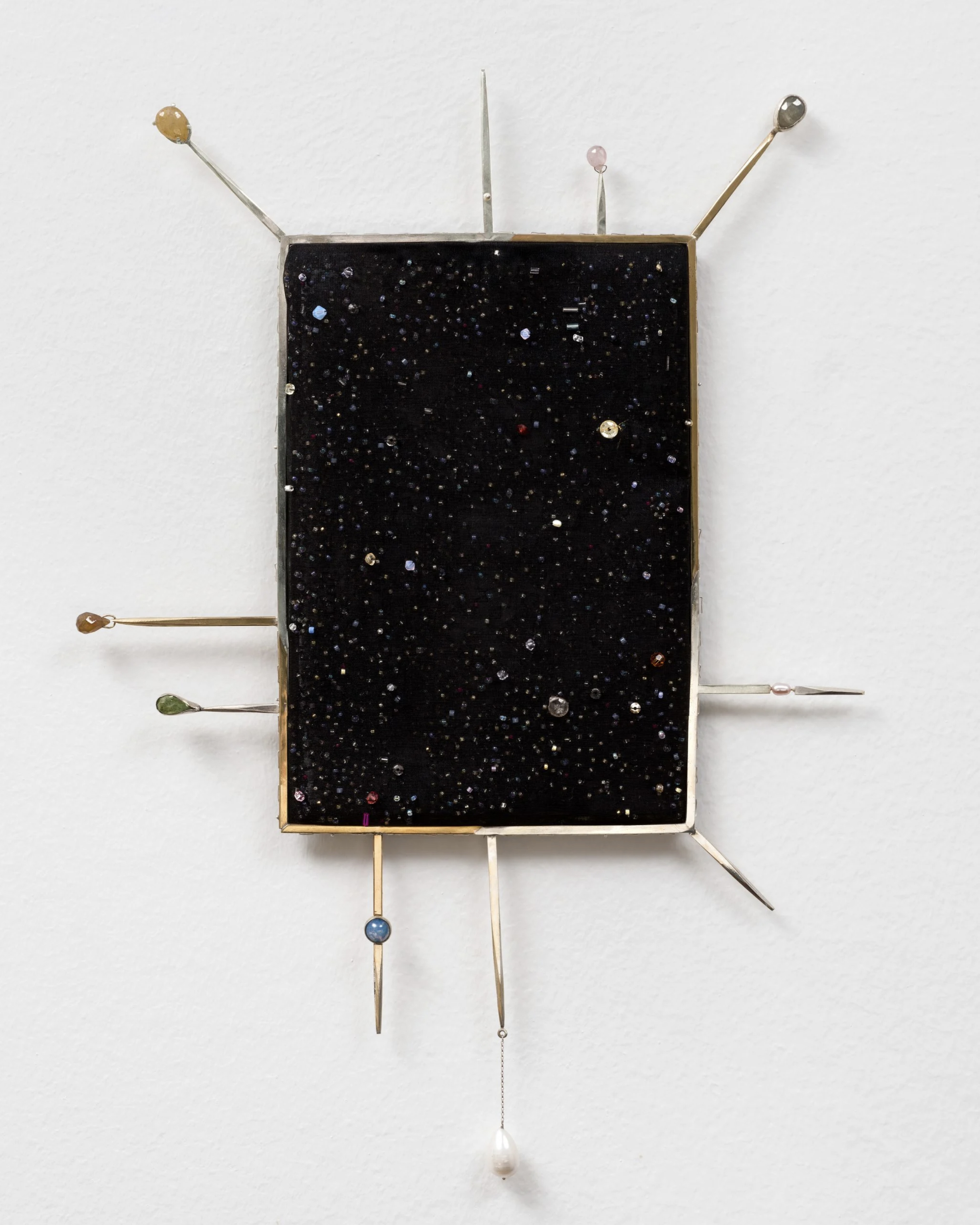 CARO, Is it the same for you?, 2023-24, sterling silver, brass, organza, beads, crystals, pearls, opals, quartz, tourmaline, 12.25 x 8.5” x 1.25 in. Courtesy of the artist/Sarah Brook Gallery