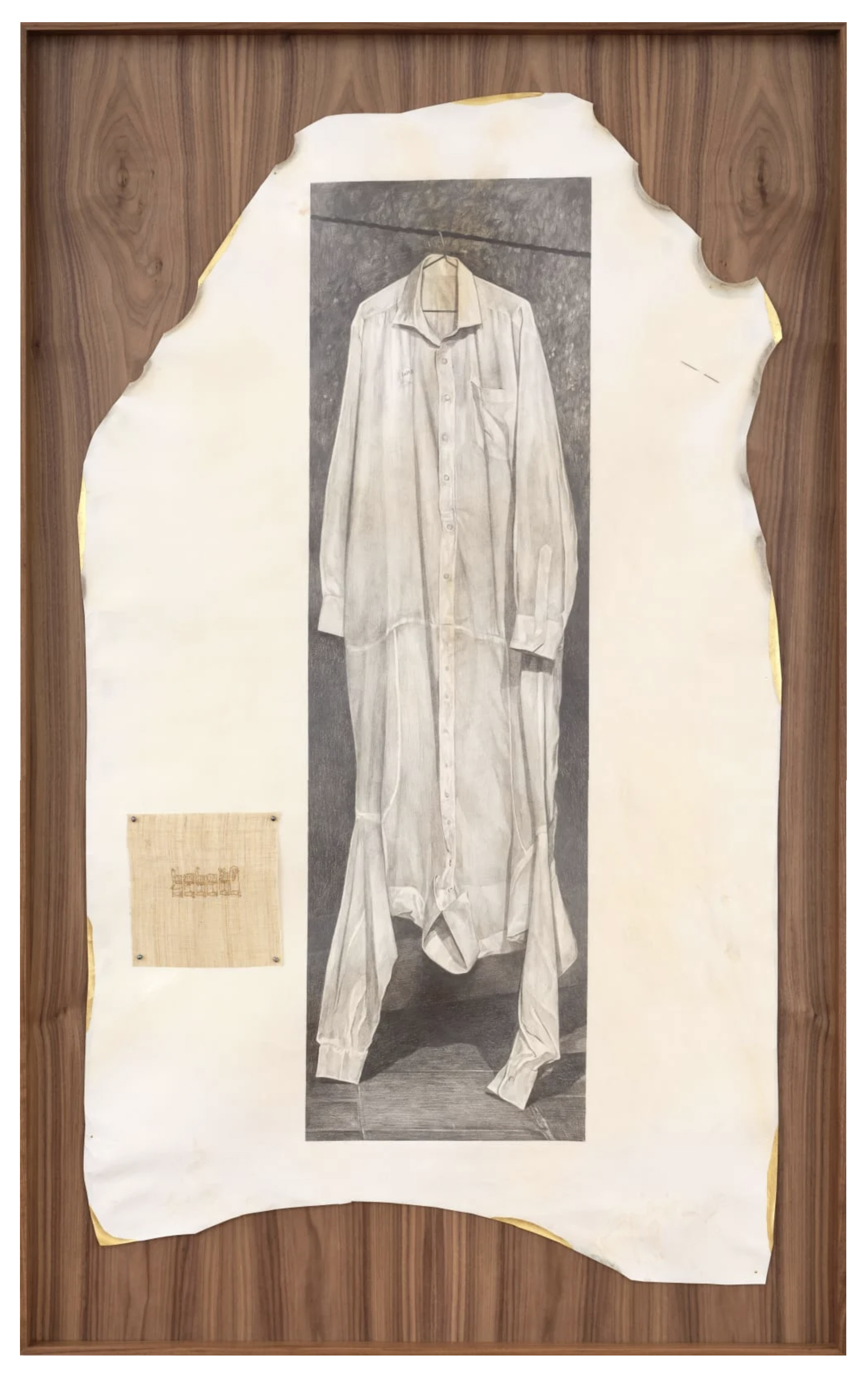 Kang Seung Lee, Untitled (Lazaro, Jose Leonilson 1993), 2023, graphite, antique 24 carat gold thread, Sambe, pearls, needle, 24 carat gold leaf, brass nails, goatskin parchment, 137.1 x 82.5 cm., MASP (Museu de Arte de São Paulo), Brazil. Photo: Paul Salveson