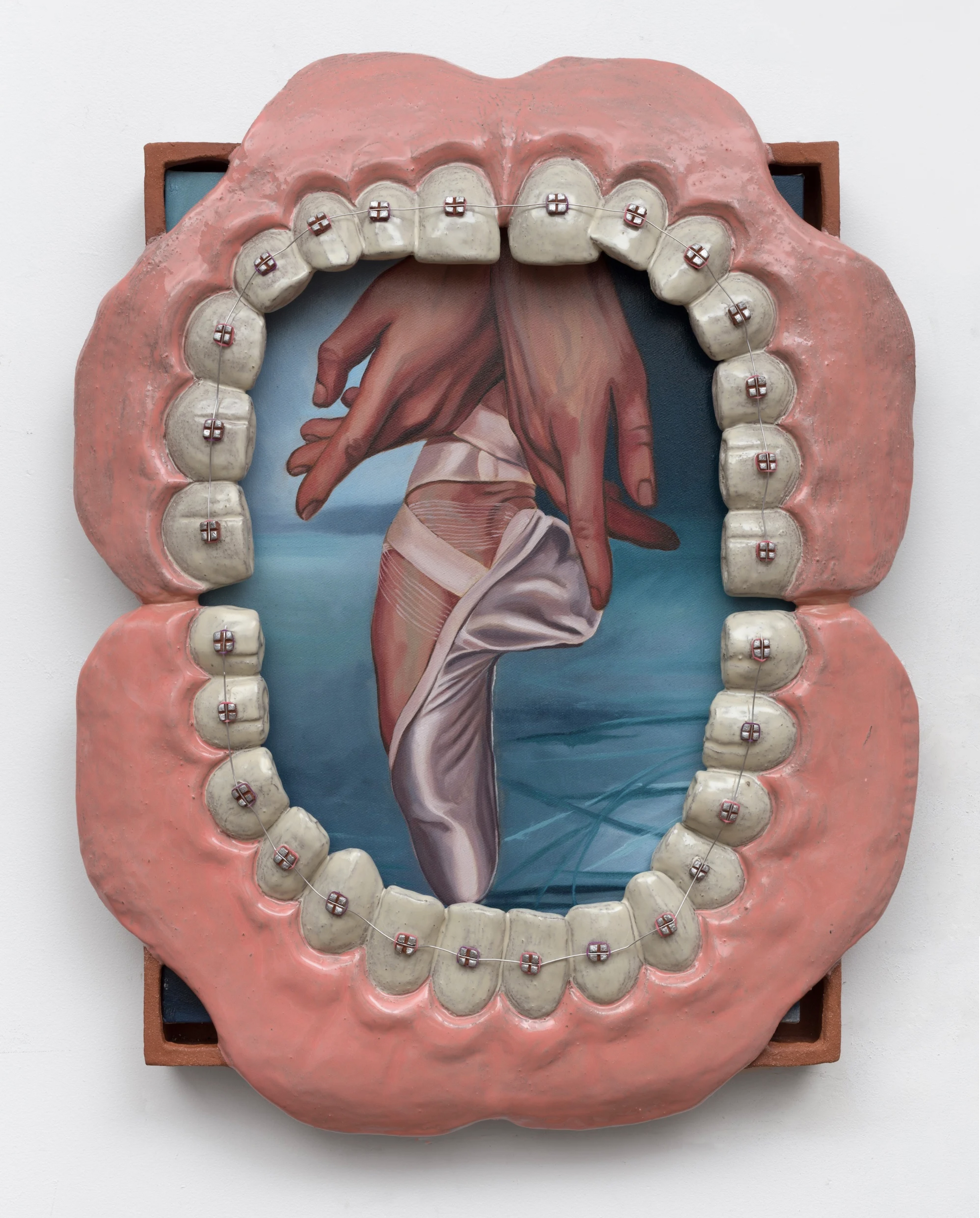 Frames and paintings form a similarly symbiotic, elaborative relationship in the work of Brooklyn-based ceramicist Stephanie Temma Hier. Her delightfully decadent works marry surrealistic, sculptural ceramic frames – a toothy mouth, molluscs, bunches of carrots – with startlingly juxtaposed oil paintings – men wrestling, en pointe ballet slippers, and bountiful heaps of food. Not unlike manuscript marginalia, her ceramic frames form associative games with the paintings inside them.