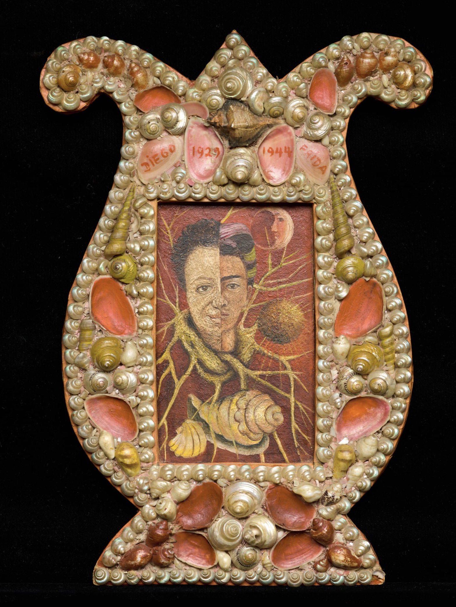 Frida Kahlo, Diego and Frida 1929–1944, 1944 , oil on masonite with original painted shell frame, private collection, Courtesy Galería Arvil. © 2021 Banco de México Diego Rivera Frida Kahlo Museums Trust, Mexico, D.F. / Artists Rights Society (ARS), New York; via Dallas Museum of Art