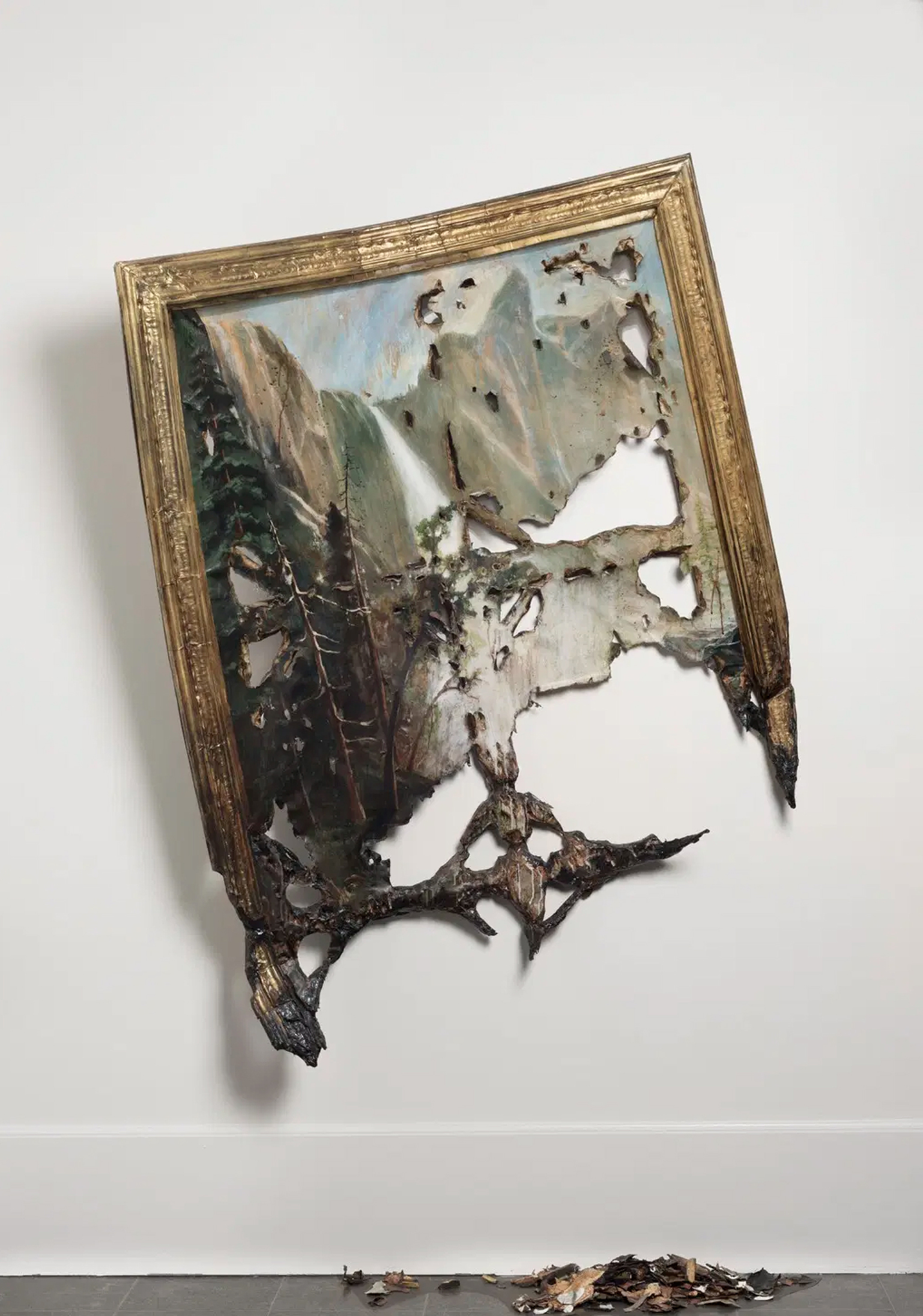 Hegarty’s works often reprise heroic landscape paintings such as those of the Hudson River School – but with a post-apocalyptic twist. A 2007 work, for instance, reimagines Albert Bierstadt’s 1869 painting Niagara Falls; in Hegarty’s work, the painting is torn, its frame twisted and charred, and everything spills downward from the wall toward the ground.