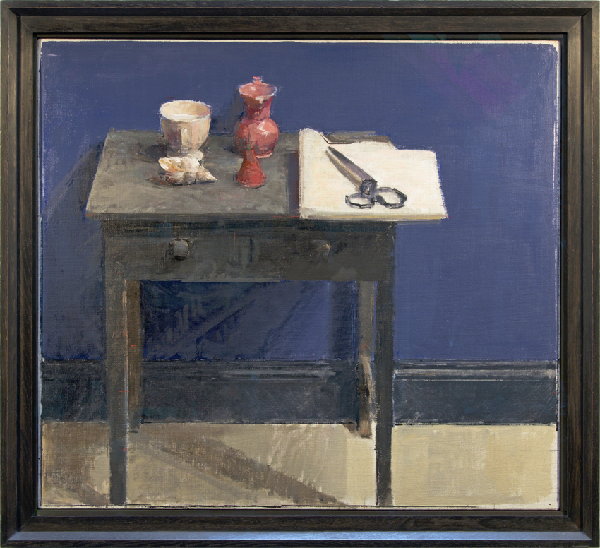 Ben Henriques, Side table in a blue interior, o/c, 31.89 x 35.83 ins (81 x 91 cm.)