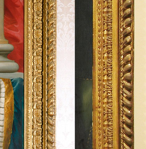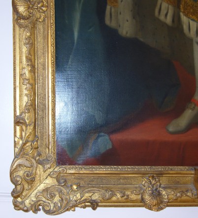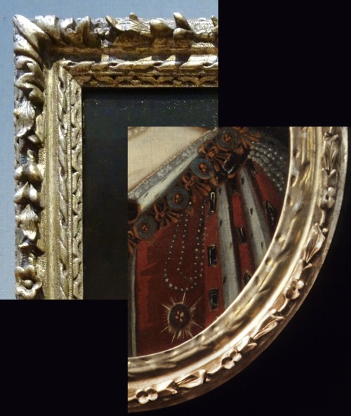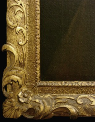 Other colonial versions of Louis XIII-style carved and gilded frames include the Anglicized panel frame (sometimes known as a ‘Lely’ frame by association with his work). This developed from the French Louis XIII convex moulding decorated with shallow-relief foliated strapwork and flowers, combined with the composition of the contemporary ‘flower corner’ pattern, also French, which together were flattened and simplified into an arrangement of ornamental carved panels alternating with plain reposes or ‘mirror panels’. The advantage of this design was that it required less carving, less labour, and thus less expence, whilst reaping the benefits of a corner-&-centre frame, where the emphases of the carved panels create focal lines which enhance the compositional lines of the painting.