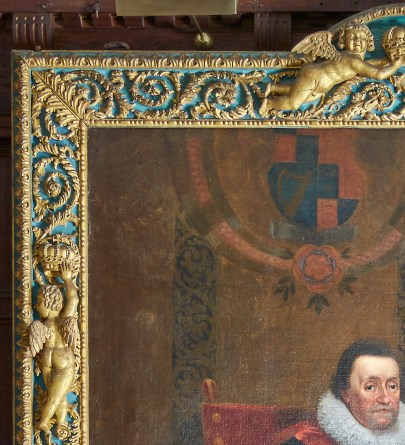 Daniel Mytens (c.1590-1648), James I of England & VI of Scotland, 1620s, o/c, 244.5 x 175.5 cm., & detail; in contemporary (possibly original) frame, gilt on a blue (restored) ground; Knole NT 129891. Photo: Laurence Pordes