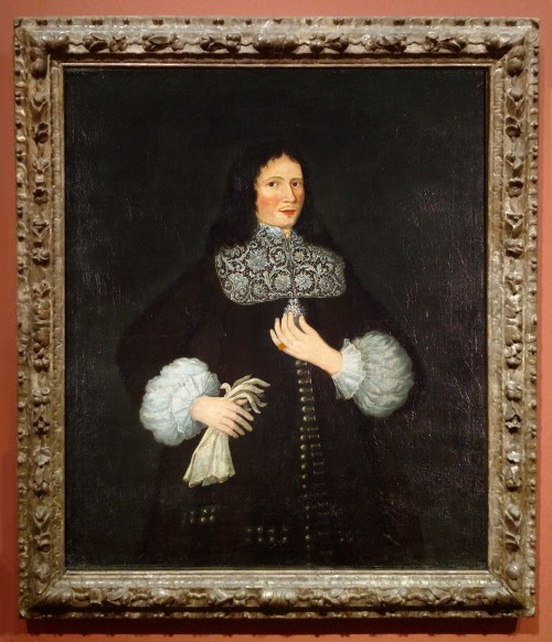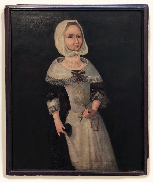 Anon., Elizabeth Eggington, 1664, o/c, 36 ¼ x 29 ¾ ins (92.1 x 75.6 cm.), and detail, Wadsworth Atheneum, Hartford