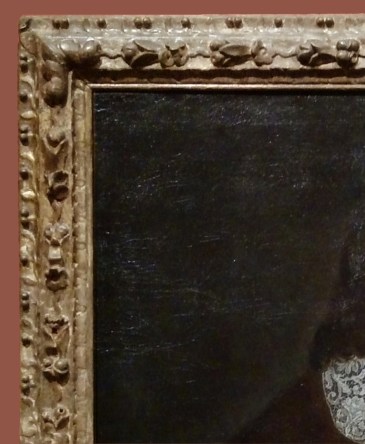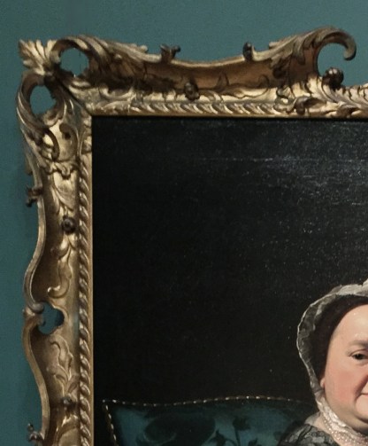 However, the frame of this group portrait is a more sophisticated example of the joiner’s frame than may first appear. Although it is relatively narrow the profile, with its deeply-cut round and hollow mouldings, is looking forward from the flat architrave and entablature frames of Renaissance Britain to the complex plastic forms of the Baroque (if not to their ornamentation and gilding); and the finish, which is now painted a puritanical black, was once coloured green, possibly in two shades (other works by the Freake-Gibbs painter which apparently retain similar early settings may on inspection have been reframed).
