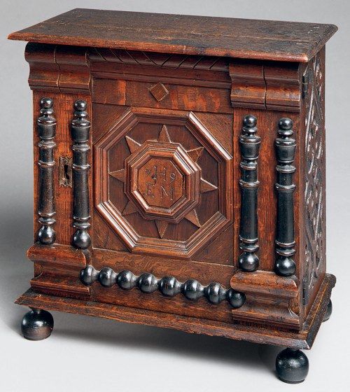 John Symonds (attrib.; workshop), cabinet, 1679, red oak, pine,black walnut,red cedar, maple, 18 x 17 x 10 ins (45.7 x 43.2 x 25.4 cm.), Metropolitan Museum of Art, New York