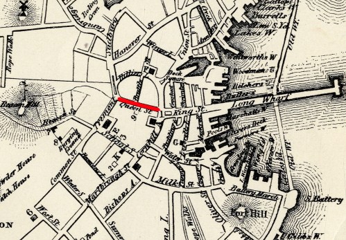 A detail from the map of Boston by Captain John Bonner, 1722, showing Queen Street (now Court Street), where Smibert established his shop