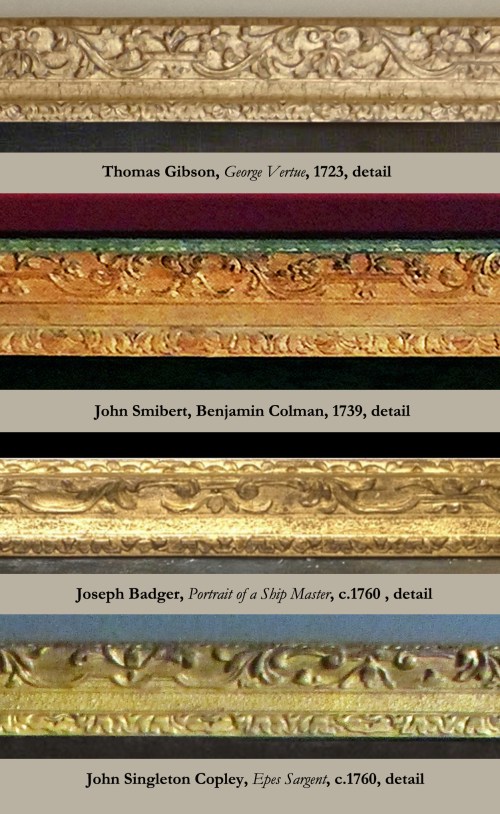 Cooper’s frames may possibly have been gilded by Jean Berger, the painter who was attacked in 1719, the attack witnessed by Cooper’s apprentice. Berger was a painter-stainer, whose skills included japanning, decorative painting and gilding; he had been painting on board a ship in Boston harbour immediately before he was attacked, and Powell, the witness, had been sent by Cooper to meet him in connection with this painting work – possibly to serve as his apprentice while it was completed [18]. As a refugee from Catholic France after the revocation of the Edict of Nantes in 1685 – an edict which had previously protected the Protestant Huguenot population – Berger would necessarily have been flexible and versatile in the use of his various accomplishments; he obviously worked for or with Cooper on other occasions, as in 1721 he sued him and his partner, Thomas Creese, ‘for failing to honour a £5 note’ [19]. The article by Robert Leath from which this information is taken notes that Creese’s brother-in-law was an art dealer, print publisher, and cabinetmaker – William Price, who advertized that he sold, amongst prints, maps, tables and cupboards, ‘oil paintings in carved and gilt frames’ [20]. This web of connections indicates that a workshop system was being established in Boston in the late 17th and early 18th centuries which would reflect the interconnectedness of the London worlds of fine and applied arts; and which could employ all the various artists and craftsmen needed to supply portraits made in pigments and oils on stretched canvases, finished with carved giltwood frames, to the growing population.