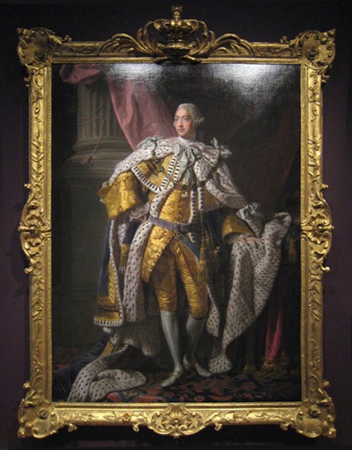The frame in this case was evidently chosen as a design which could be considered appropriately opulent for a monarch and was also still fashionable in Europe, whilst being both ornamental and easy to reproduce. Like the painting itself, the carving is quite schematic and stylized. The oval form may be partial assurance that it was made in Boston rather than London, to fit the canvas of the portrait; this form was also influenced by the trompe l’oeil frames used in the prints.