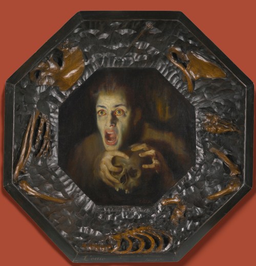 The subject of the painting has its own catalyst, ‘Il canto dell’odio’ or ‘The song of hate’, a work of 1877 by Olindo Guerrini, an Italian poet known as Lorenzo Strecchetti (1845-1916). It is a poem put into the mouth of a man rejected by the woman he was worshipped, but who was promiscuous with all others. She has died, and he imagines her decayed and corrupt beauty; he also imagines himself digging up her remains, tearing out her heart and whispering his hatred into her dead ear. Vučetić paints this man as the essence of hatred, in the form of Bernini’s damned soul; the frame, by Kovačić, with its impossibly deeply canted hollow, focuses on him as if at the bottom of a well of earth or of the grave itself, with the bones and organs of the dead woman strewn around him.