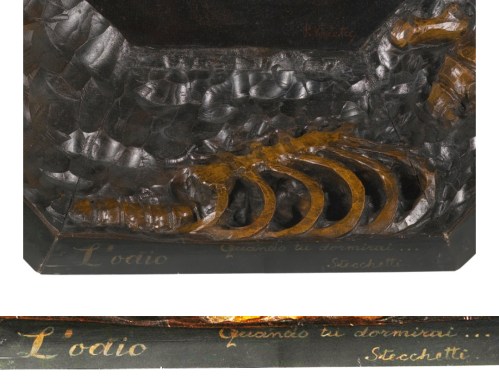 Paško Vučetić &Viktor Kovačić, Hatred and madness, detail of inscription on frame: ‘L’odio… Quando tu dormirai… Strecchetti’