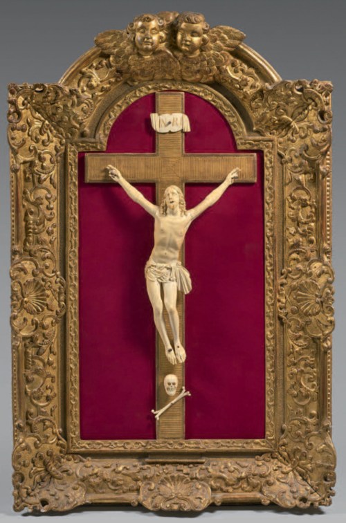Lot 80: French school, Christ crucified, 17th century ivory, 68 cm., in Louis XIV carved giltwood frame, convex profile with slight ogee from top edge; with foliate corner cartouches, scallop shell centres; frieze with scrolling foliate strapwork; small sanded frieze; concave sight edge with opposed C-scrolls & leaf buds; 94 x 60 cm., Hôtel Drouot, Paris, 28 March 2018; estimate €2 – 2,500