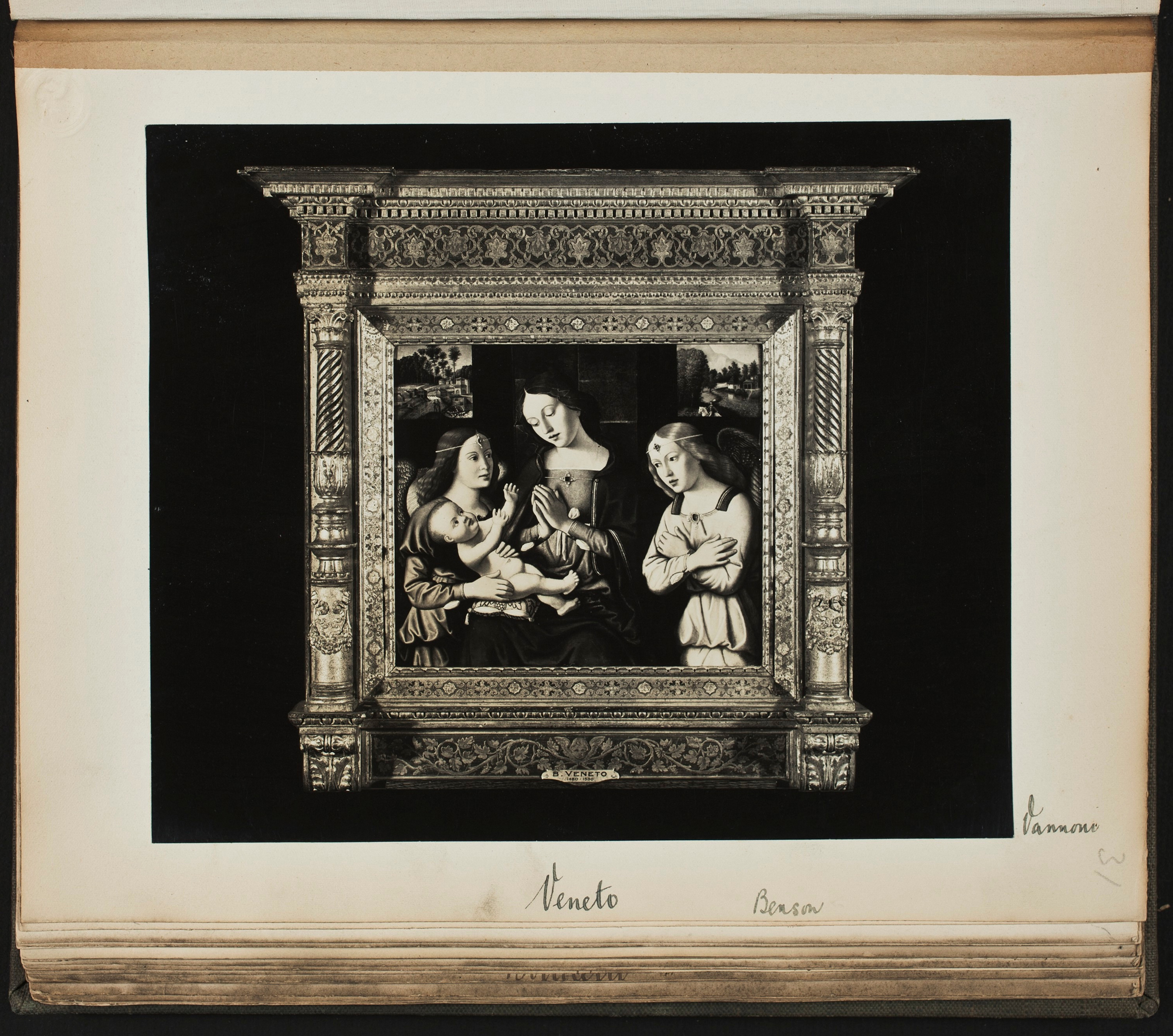 It was taken up enthusiastically by dealers like Joseph Duveen. The Duveen brothers had built up a sizeable transatlantic traffic in paintings from the homes of impoverished British aristocrats to the opulent houses of American entrepreneurs. These works sold much better when they were set off by richer, less shabby or more chronologically connected frames, and Guggenheim’s illustrations became a pattern-book for reframing Italian Renaissance paintings. The page, immediately above, from a Duveen album of photos is marked ‘Veneto’ for the style of frame, ‘Benson’ for the collector to whom this painting had belonged, and ‘Vannoni’ for Ferruccio Vannoni.
