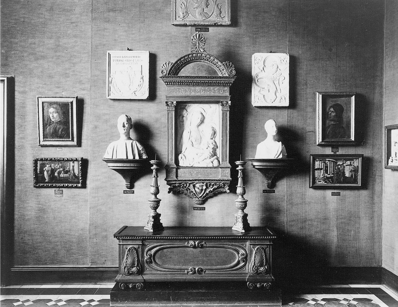 A display of paintings, sculpture and sculptured reliefs, furniture and applied arts in the Kaiser-Friedrich-Museum, Berlin (later the Bode Museum), 1919-33, centred on a framed relief of the Madonna & Child by Antonio Rossellino, c.1460-70. Photo: © Berlin, Staatliche Museen, Skulpturensammlung, Archiv