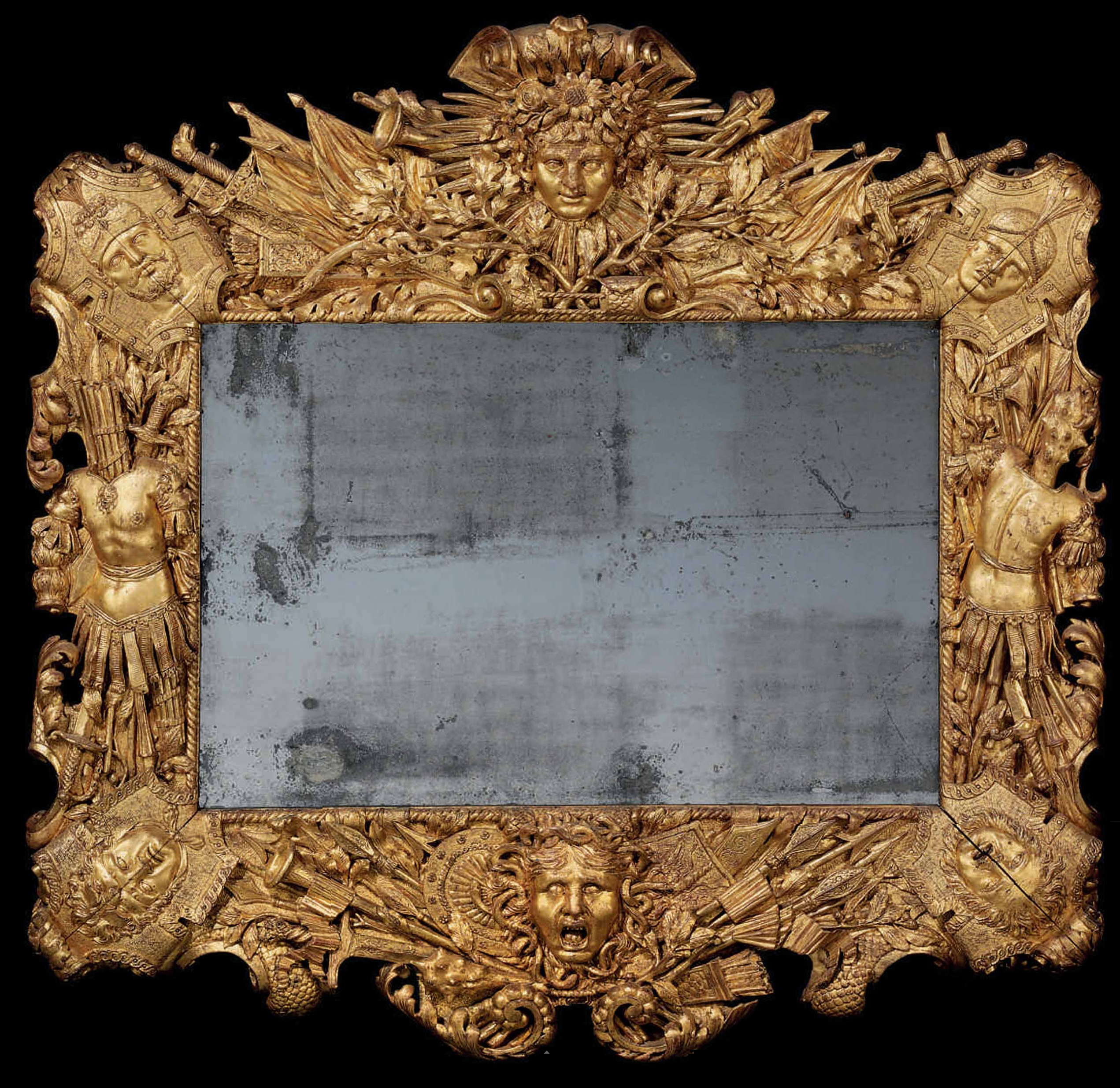 Louis XIV carved giltwood trophy frame on an antique looking-glass plate, 117 x 122 cm., Christie’s, London, 6 December 2012, Lot 8
