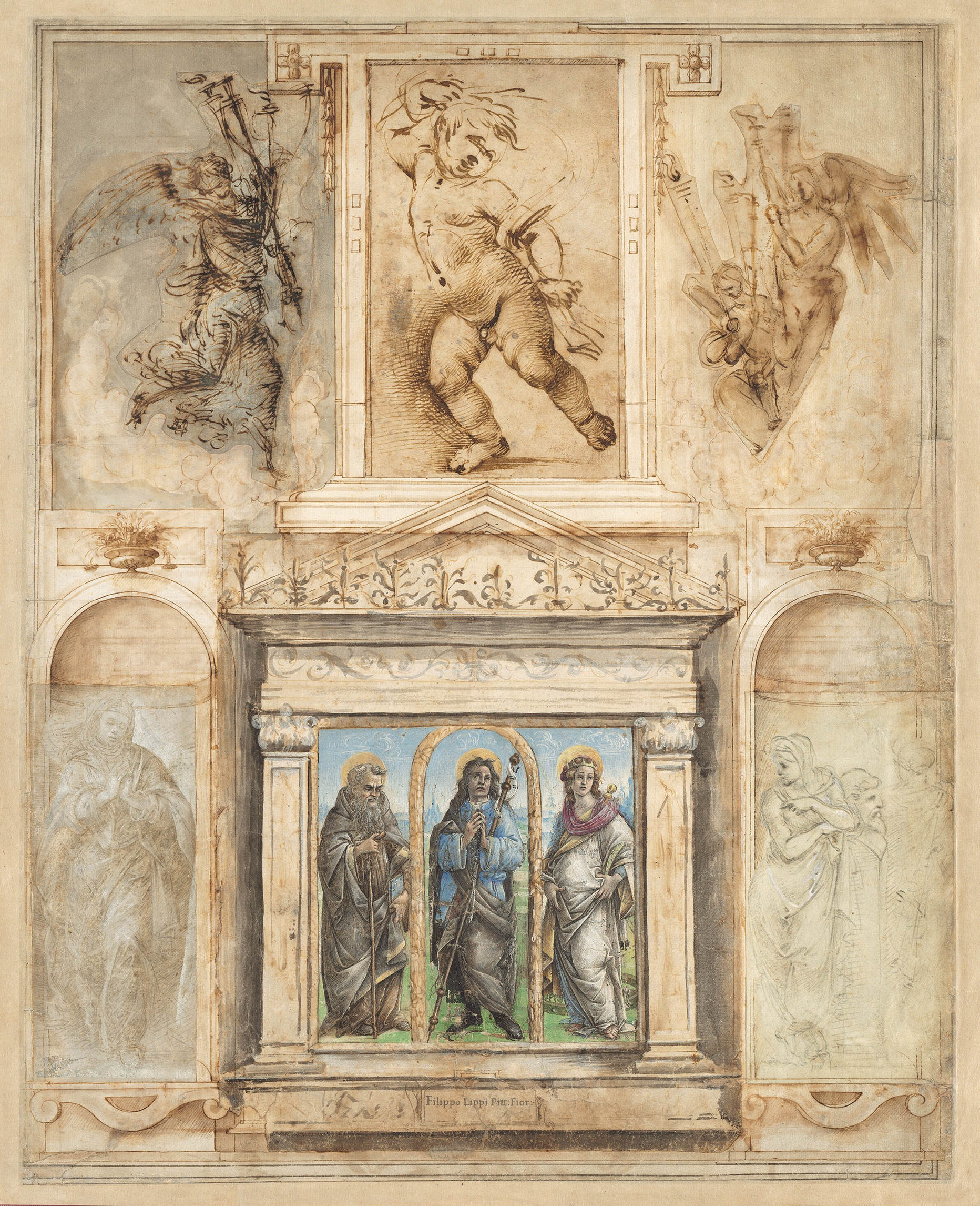 Giorgio Vasari (1511-74), frames (post-1524) around drawings (c.1480-1504) by Raffaellino del Garbo & Filippino Lippi from the Libro de’ disegni, NGA, Washington