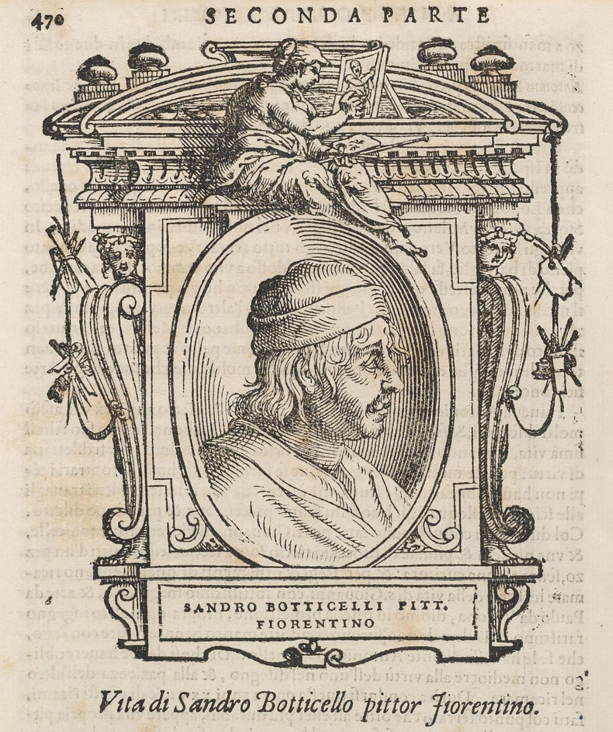 Vasari, framed portrait for the essay on Botticelli in Le Vite de’ Piu Eccellenti Pittori Scultori et Architettori…, 1550 & 1568, Royal Collection Trus https://www.rct.uk/collection/1152361/delle-vite-de-piu-eccellenti-pittori-scultori-et-architettori