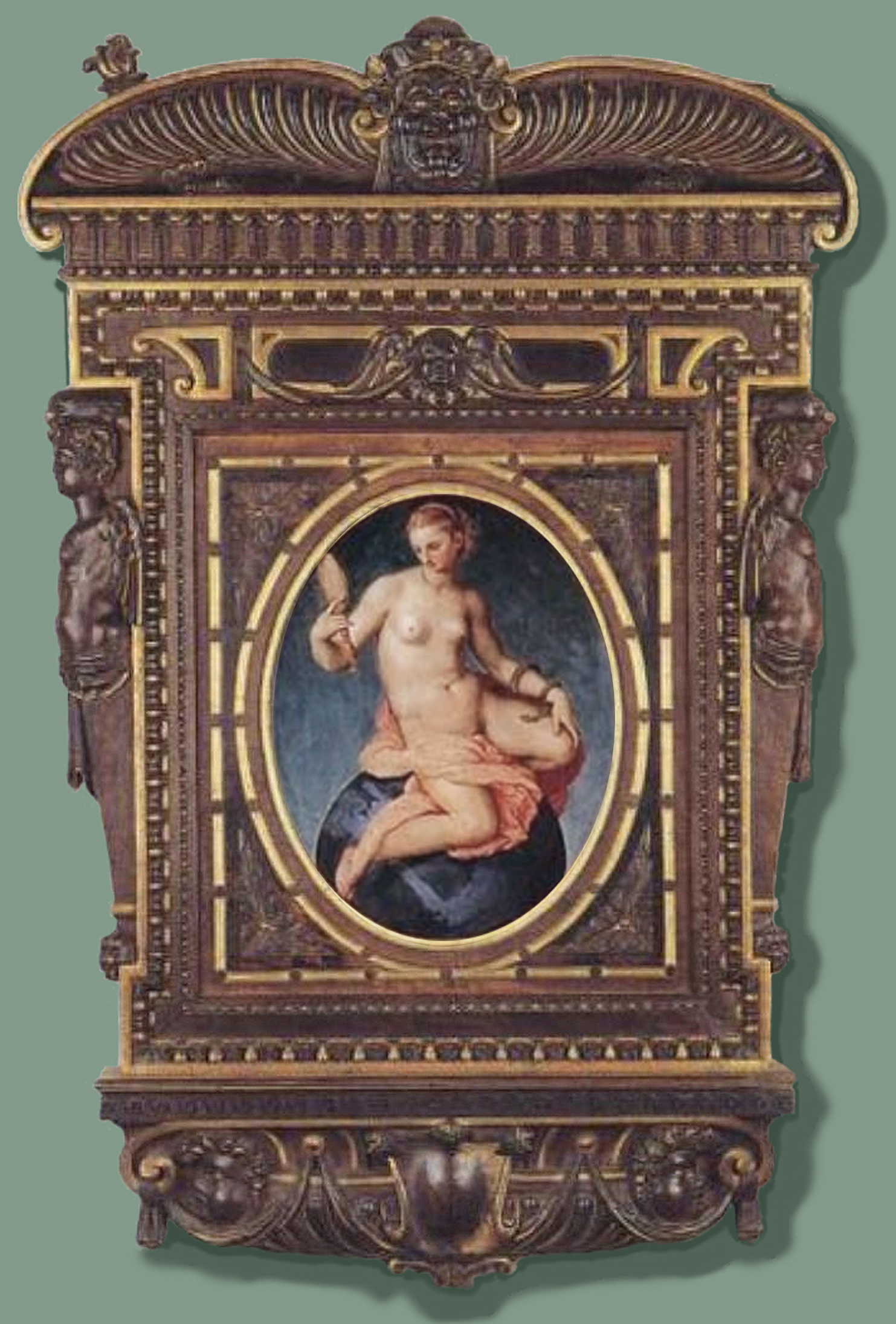 Vasari, Mannerist looking-glass frame in parcel-gilt walnut carved by Alessandro Allori, with the Allegory of Prudence painted by Vasari on the cover, Casa Vasari, Arezzo