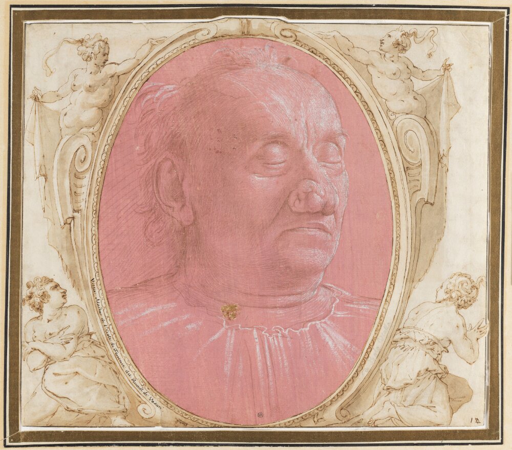 We can be fairly certain that Vasari wasn’t contemplating the figures on the frame he gave to Ghirlandaio’s old man as ‘deictic cues’. These particular four women are there to expand upon the meaning of the drawing (sometimes referred to as the Head of a dead man) by filling the place of mourners on the frame of a carved, wall-mounted tomb. They are at the same time a slightly macabre jeu d’ésprit on Vasari’s part, and an expression of authentic emotion matching the dignity given to the subject of Ghirlandaio’s drawing. The four of them might have decorated a carved giltwood picture frame, if there had been space for a larger structure; as it is, they are pushed into the corners of the paper, and given the realism found in engraved portrait frames in the 17th century. The two caryatides at the top perform the function of drawing back curtains to disclose the dead man, as though he were lying in state in a chapel. Without these funereal handmaidens, the drawing might have remained what it is also called, the Portrait of a man with his eyes shut; as it is, Vasari has interpreted it for himself and all those who look at it, as well as displaying it like a full-scale work of art in a decorative setting.