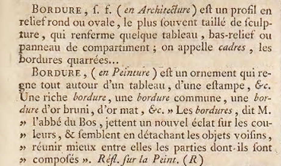 ‘Frame [bordure] (in painting) is the ornamental margin which commands the outer edge of a painting, a print, etc. A rich border, a plain border, a border of burnished gold, matte gold, etc. ‘Frames,’ says the Abbot du Bos, ‘throw a new brilliance onto colours, and seem, by causing neighbouring objects to stand out from each other, to unite better the parts of which they are composed.’ ’