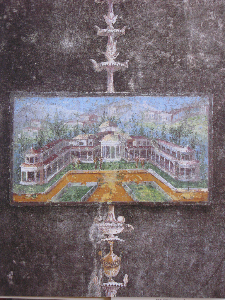 Several of its fresco-covered rooms were removed, and eventually found their way to the National Museum at the Palazzo Massimo alle Terme, where they are beautifully displayed today. The house is thought perhaps to have been built for Marcus Agrippa, Roman general and friend of Augustus, and a major patron of the arts. The walls are decorated in what is known as the Third Style of Roman painting, when the trompe l’oeil scenic windows and architecture of the Second Style became flatter and more like a depiction of a real wall. Thus these images could be seen as a picture of a Roman interior from that time, with decorations such as might be found in a wealthy house.