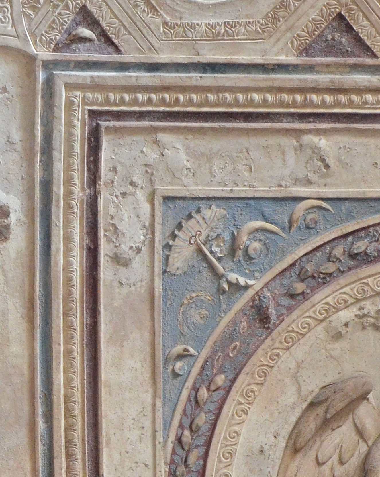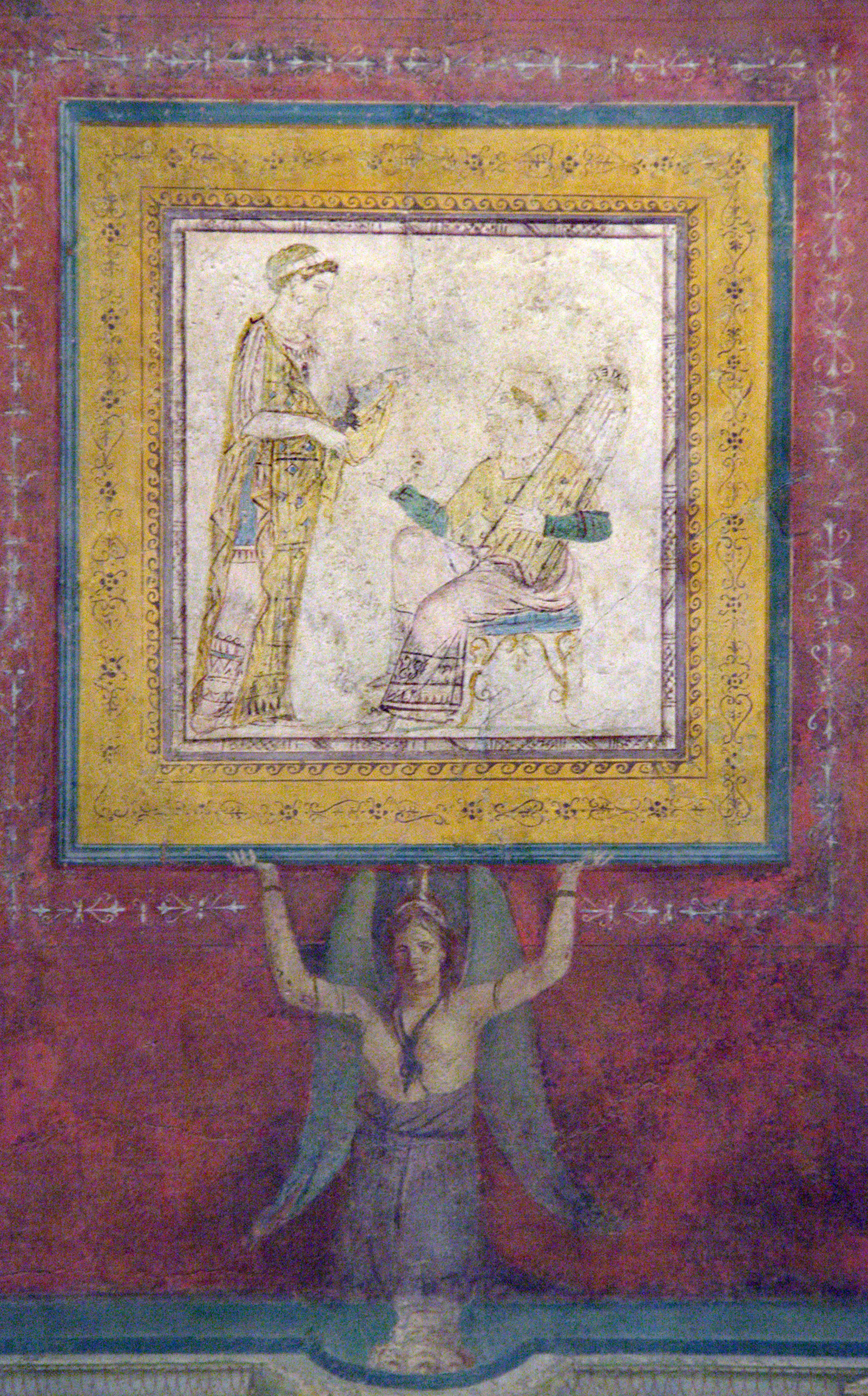 The hands of the caryatid are clearly supporting the three-dimensional frame of a painting: a trompe l’oeil cassetta with a blue-green moulding around a yellow frieze decorated with arabesques and a Vitruvian scroll, and an ornamental border at the sight edge. The blue-green outer moulding has a well-defined sculptural profile and is lit by raking light from the right-hand side, since the profile can be read in detail on the lower left side, while it is in shadow on the upper right. There is also a highlight along the outer edge at the right, and the trompe l’oeil effect is further enhanced by the delicate white tracery on the red wall, which passes directly behind the winged caryatid.