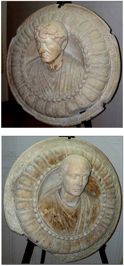 Two imagines clipeatae, 2nd century AD, Baths of Mithras, Ostia. Photo: Guy de la Bédoyère