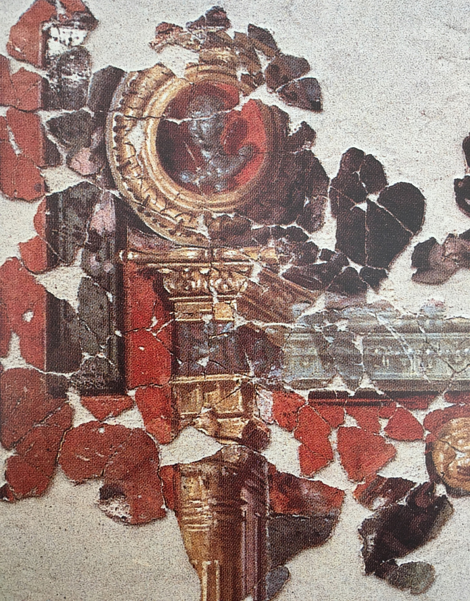 Another way in which pictures are sometimes depicted in Roman wall paintings shows them as if displayed on a standing tripod, placed in front of a wall. This might be only a convention of wall decoration, but given the period in which these objects are often found, which stressed the accurate depiction of an ornamental motif, I would think that they might well represent a realistic method of displaying art inside the home. A good example is found in the House of Marcus Lucretius Fronto, where two landscape paintings are displayed on vertical tripods, like large candelabra. Against this theory of imitative realism is the fact that there are no visible signs of support between tripod and picture indicated, but this could be explained in various ways.