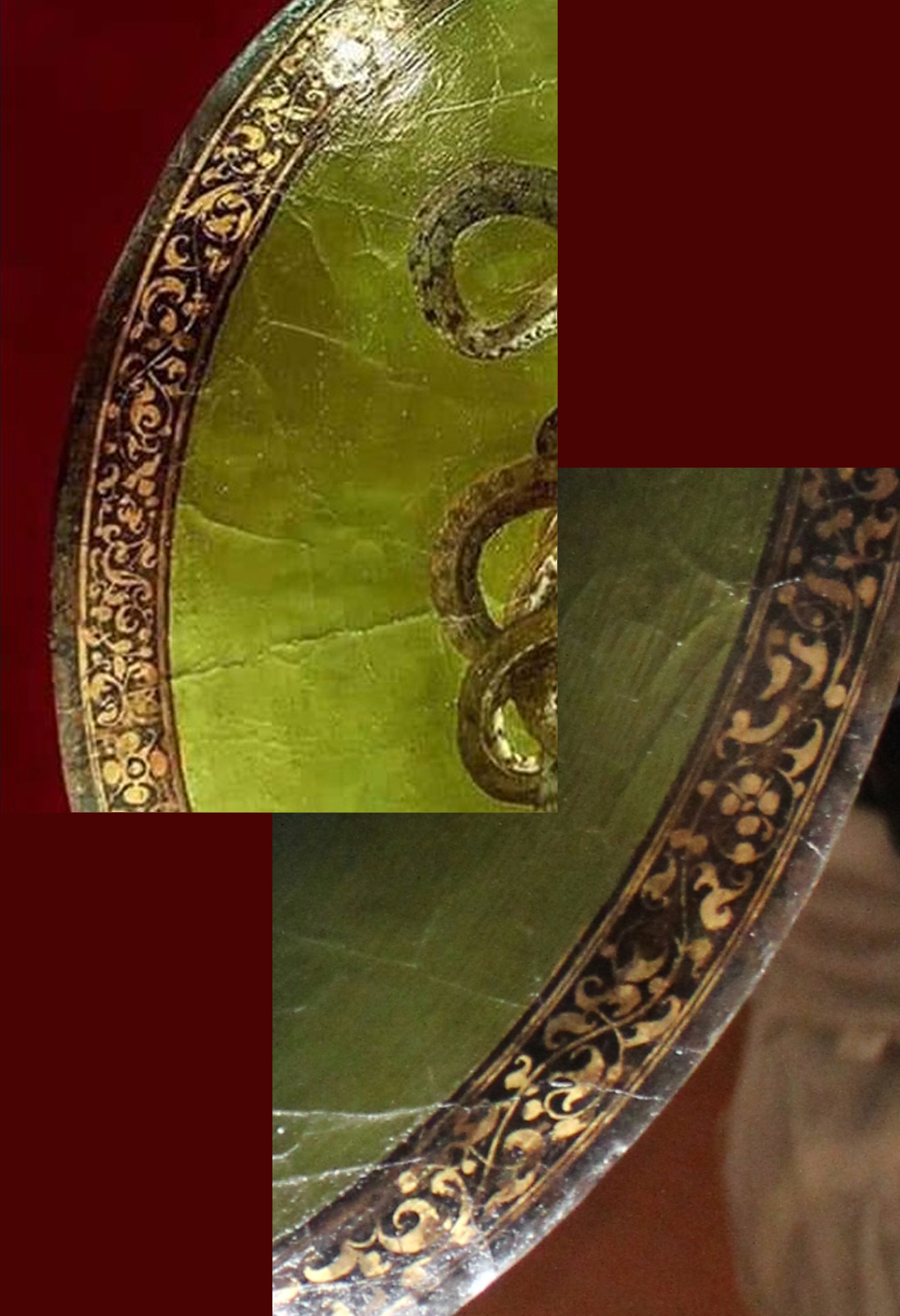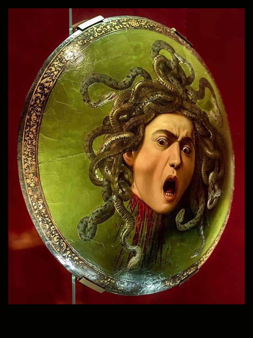 The imago clipeata directly influenced Baroque art through Caravaggio’s Head of Medusa, a depiction of the shield of Athena, to whom Perseus presented the Gorgon’s head and who set it in the centre of her shield to terrify her enemies. Caravaggio’s ‘frame’ here is painted directly on the canvas, in a band of black on top of a gilded border. The decorative foliate scrolling is then created in sgraffito, by scratching it through the paint to reveal the gold. It mimics decoration in niello (also used by the Romans), damascening and engraving on weapons and armour.
