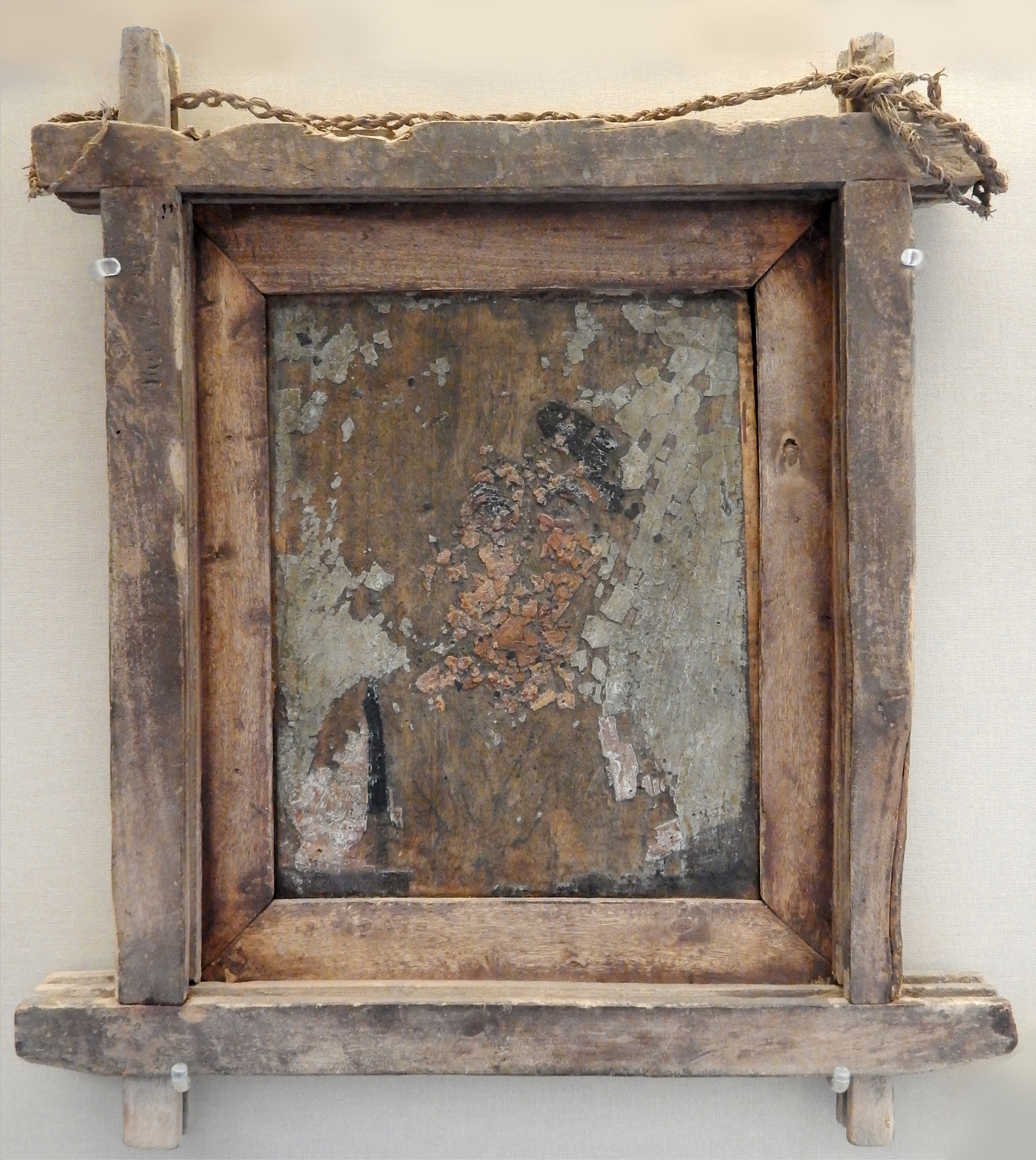 There is very little in the way of Greek or Roman free-hanging art which has survived, though there is one example of a rather crude frame around a Romano-Egyptian ‘mummy’ portrait, dating from the 1st century, at the British Museum, and one (a little later) on a depiction of the god Heron in Rhode Island. Both frames have what may seem rather a primitive construction to modern eyes, with crossed corners; however, the rails are let into each other very neatly where they cross, and the portrait frame has inset grooves, possibly to hold a sliding shutter. This type of frame was resurrected, almost certainly fortuitously, in the ‘Oxford’ frame of the 1860s. It is unclear how such settings would have been finished, but it can be conjectured that they would have been painted and possibly gilded, producing a much more sophisticated and decorative appearance than remains now.